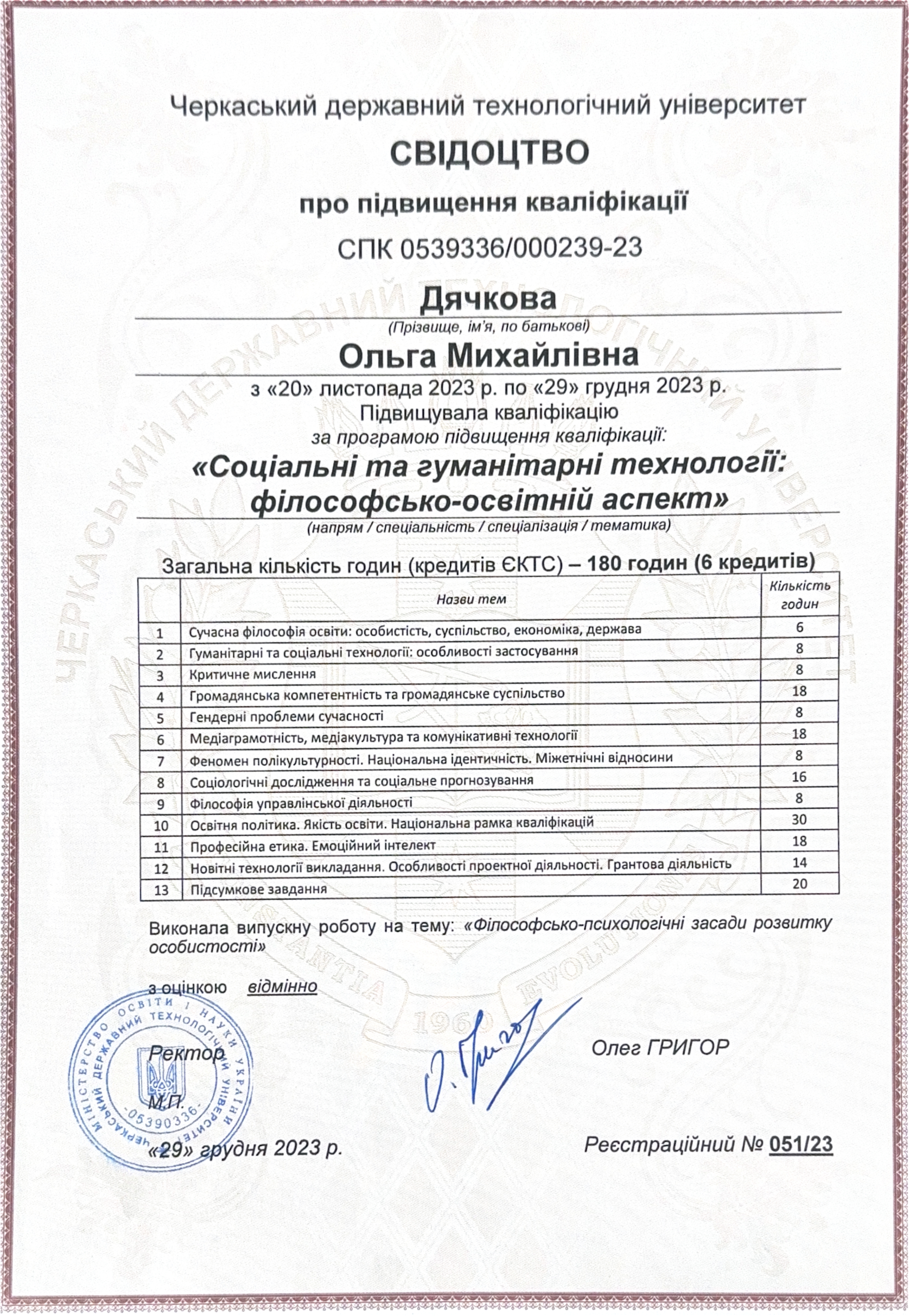 - З 20 листопада по 29 грудня 2023 року пройшла підвищення кваліфікації за програмою: «Соціальні та гуманітарні технології: філософсько-освітній аспект» (180 годин, 6 кредити ЄКТС)