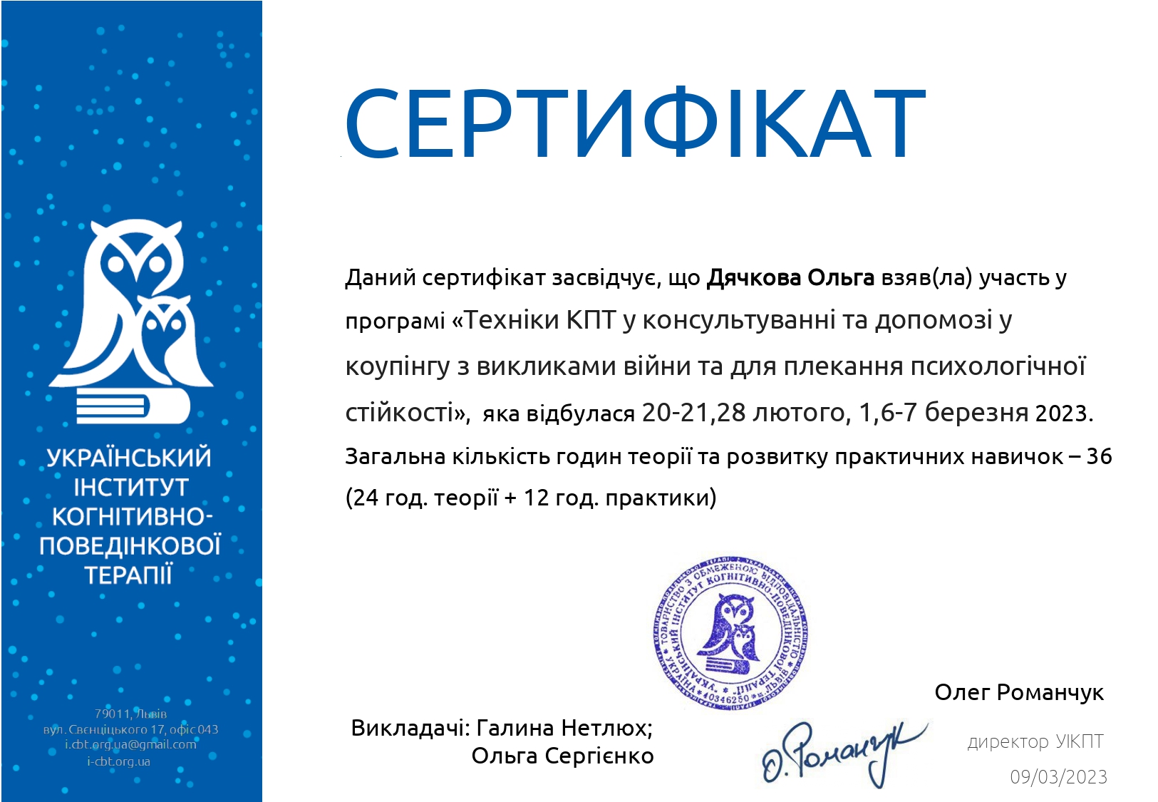 - У 2023 році взяла участь у програмі «Техніки КПТ у консультуванні та допомозі у коупінгу з викликами війни та для плекання психологічної стійкості» (36 годин)