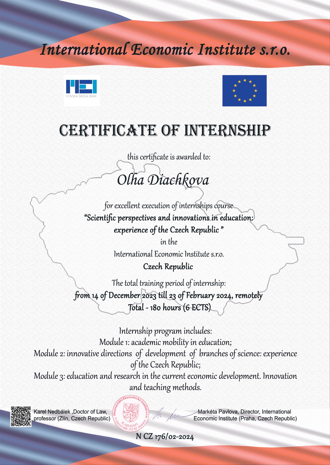 - З 14 грудня 2023 року по 23 лютого 2024 року пройшла міжнародне стажування для педагогічних та науково-педагогічних працівників у м. Есеніце (Чеська Республіка) «Наукові перспективи та інновації: досвід Чеської Республіки» (180 годин, 6 кредити ЄКТС), про що отримала сертифікат NCZ 176/02-2024
