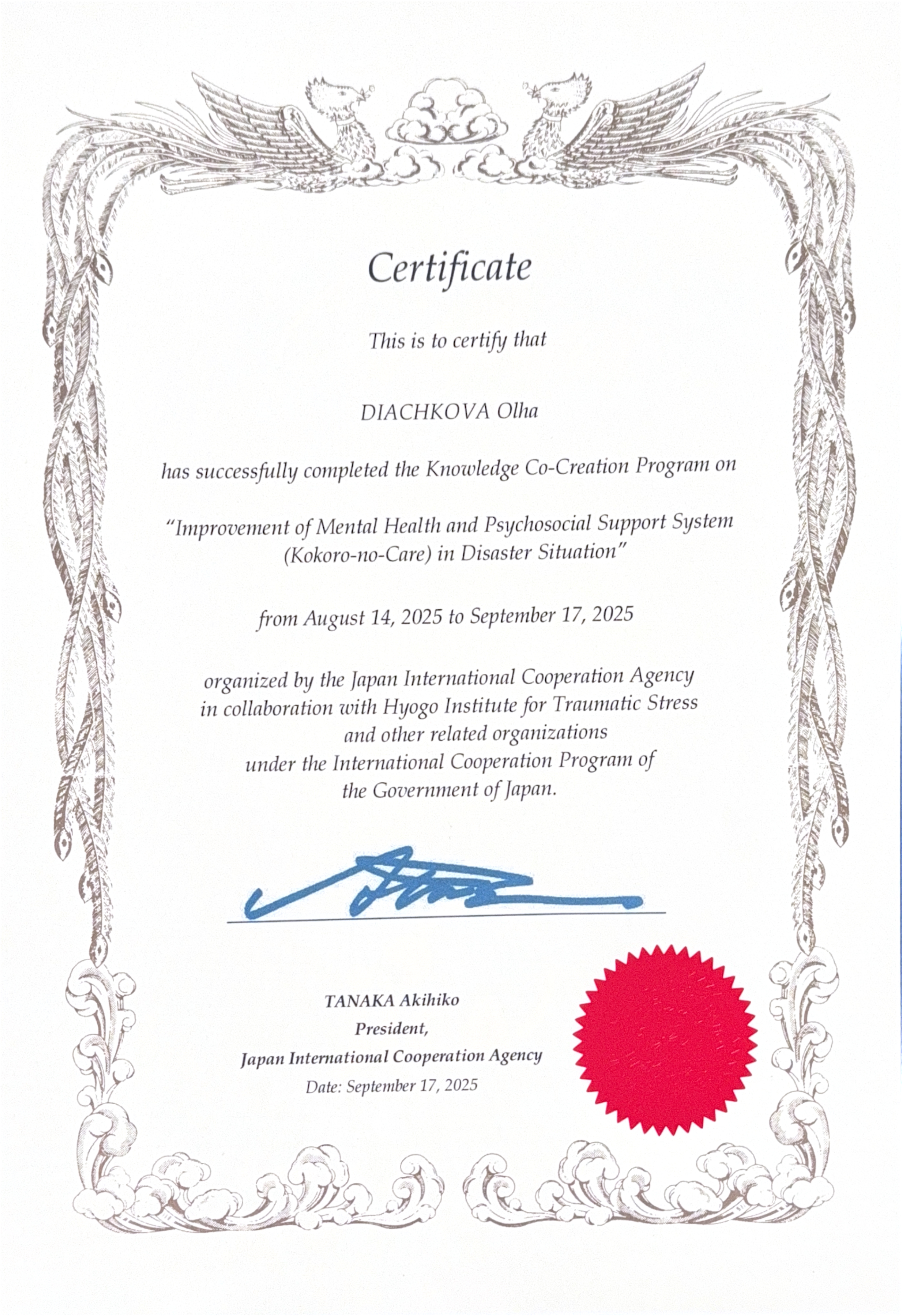 - З 14 серпня по 18 вересня 2025 року взяла участь у міжнародній навчальній програмі «Удосконалення системи ментального здоров’я та психосоціальної підтримки (Kokoro-no-Care) в умовах надзвичайних ситуацій», м. Кобе, Японська Держава