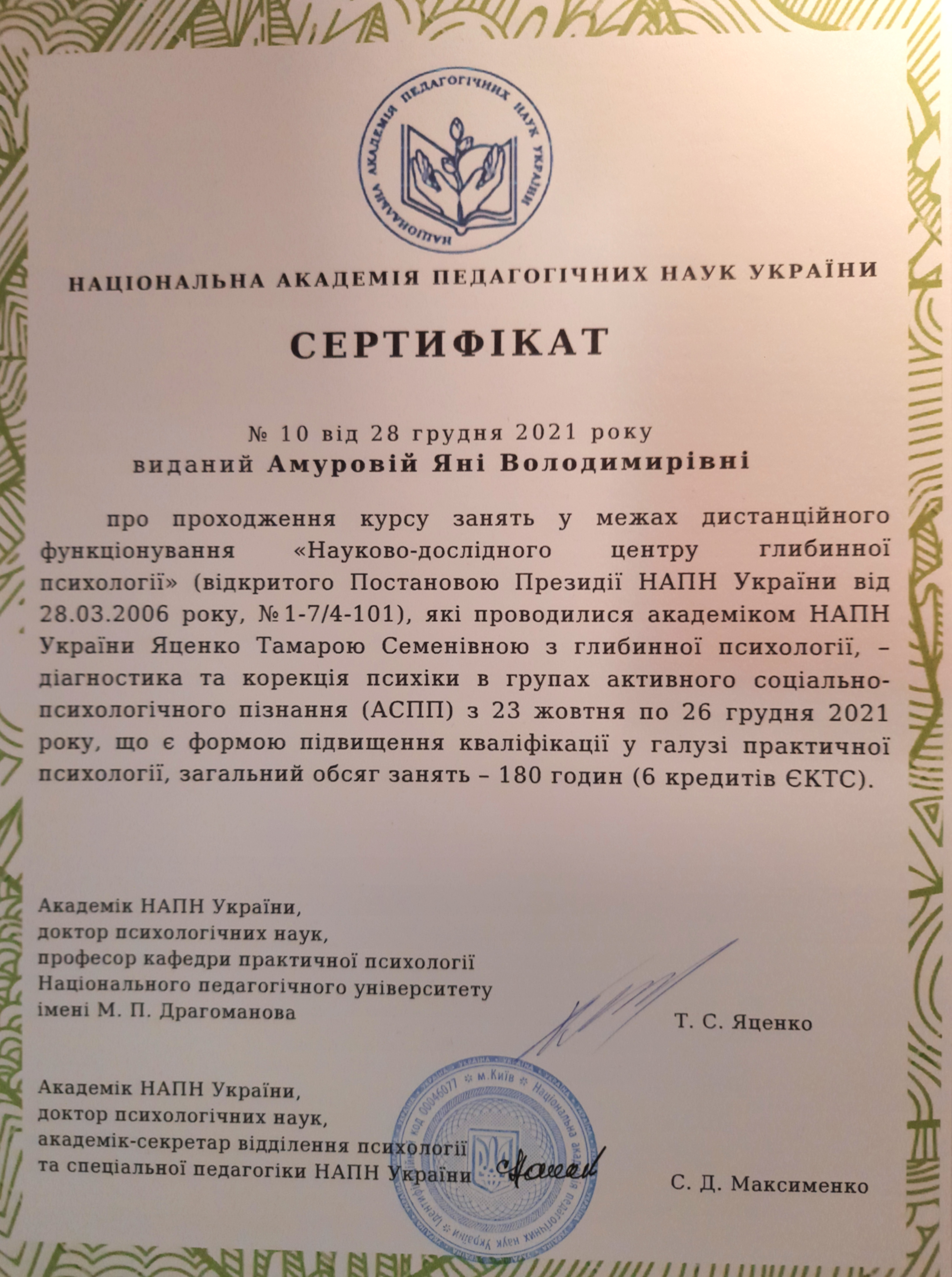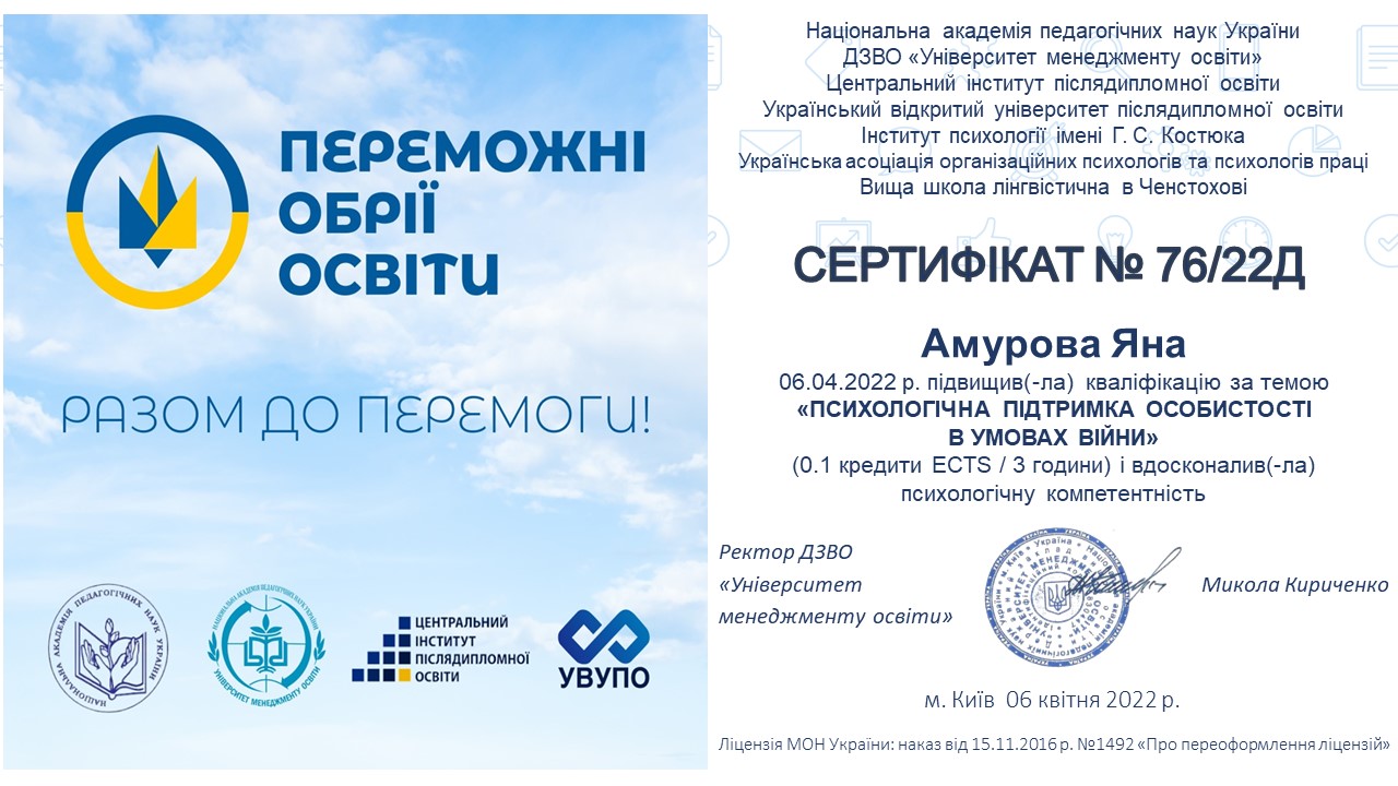 У 2023 році підвищила кваліфікацію за темою «Психологічна підтримка особистості в умовах війни» (3 години).