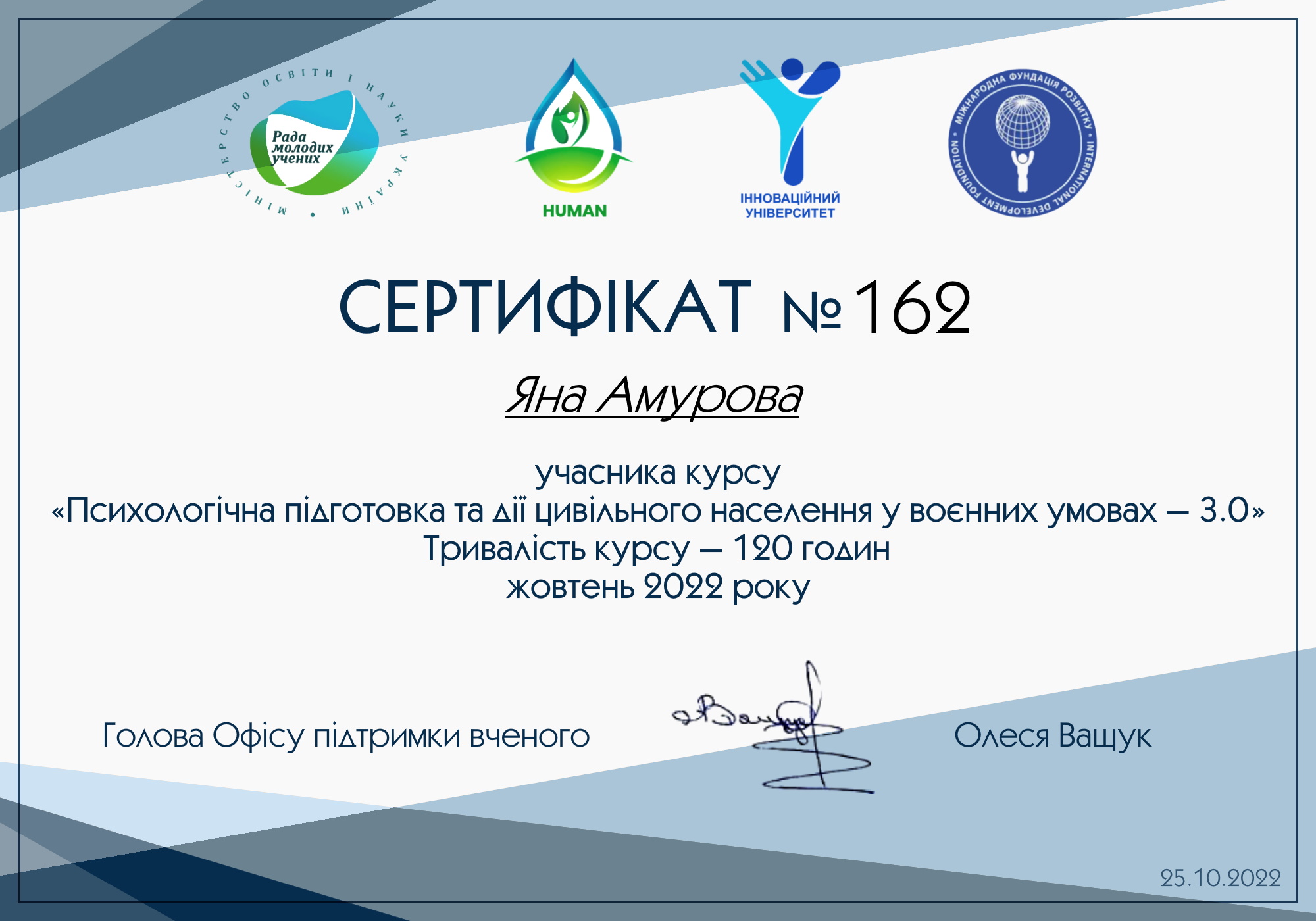 У квітні 2022 року пройшла курс «Психологічна підготовка та дії цивільного населення у воєнних умовах – 3.0» (120 годин).