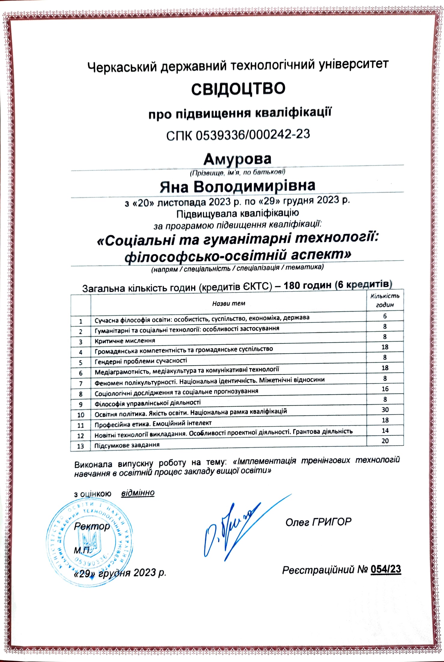 З 20 листопада по 29 грудня 2023 року пройшла підвищення кваліфікації за темою «Соціальні та гуманітарні технології: філософсько-освітній аспект» (180 годин).