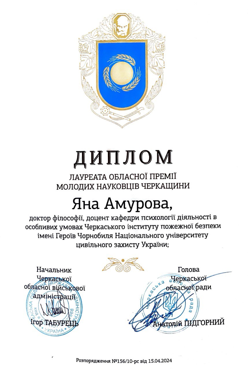 У 2024 році стала лауреатом обласної премії молодих науковців Черкащини.