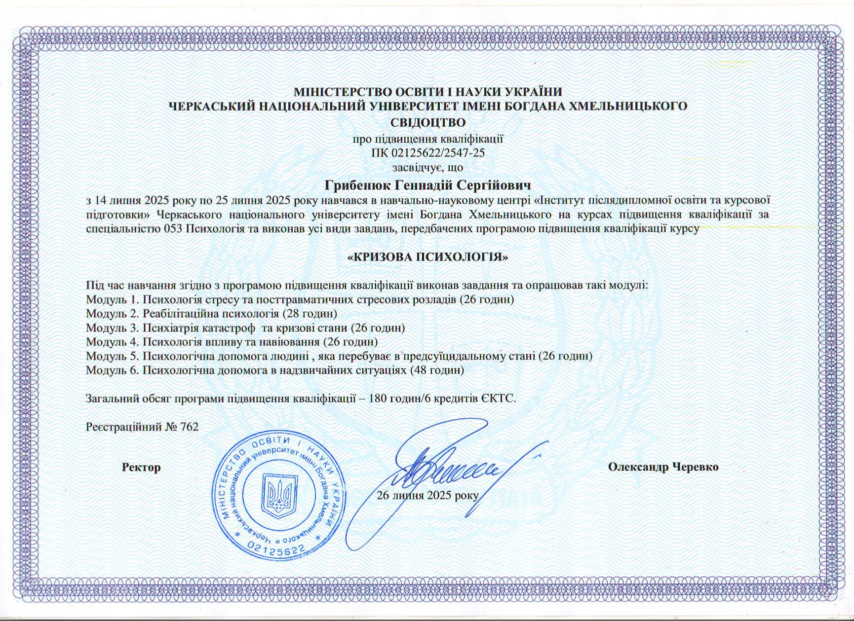 - Черкаський національний університет імені Богдана Хмельницького. Свідоцтво про підвищення кваліфікації за програмою «Кризова психологія». ПК № 02125622/2547-22 від 26.07.2025 (180 год.)