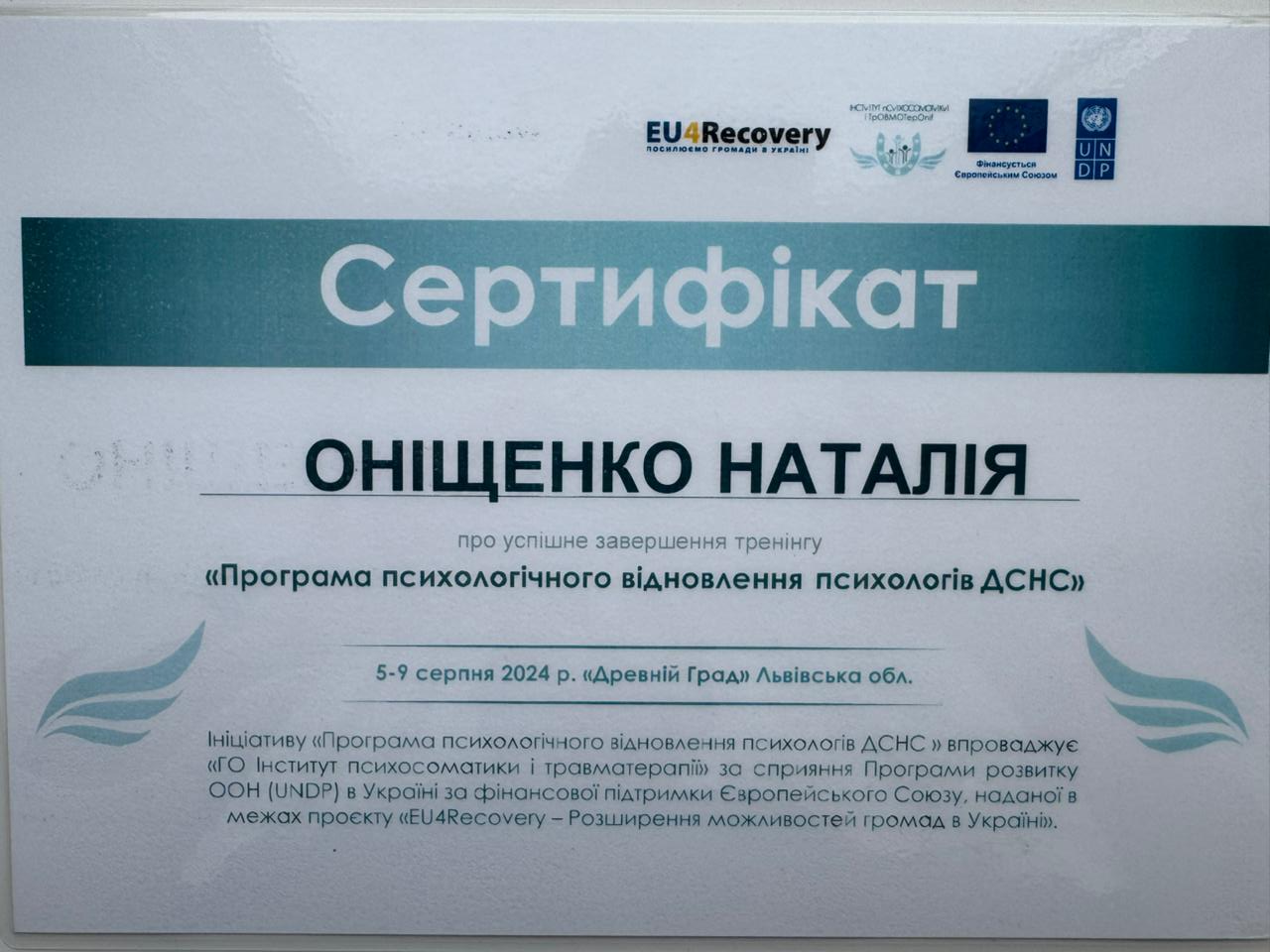 - У серпні 2024 року взяла участь у тренінгу «Програма психологічного відновлення психологів ДСНС».