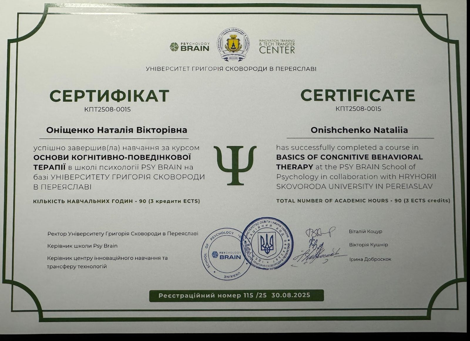 - Впродовж серпня 2025 року пройшла навчання за курсом "Основи когнітивно-поведінкової терапії" (3 кредити).
