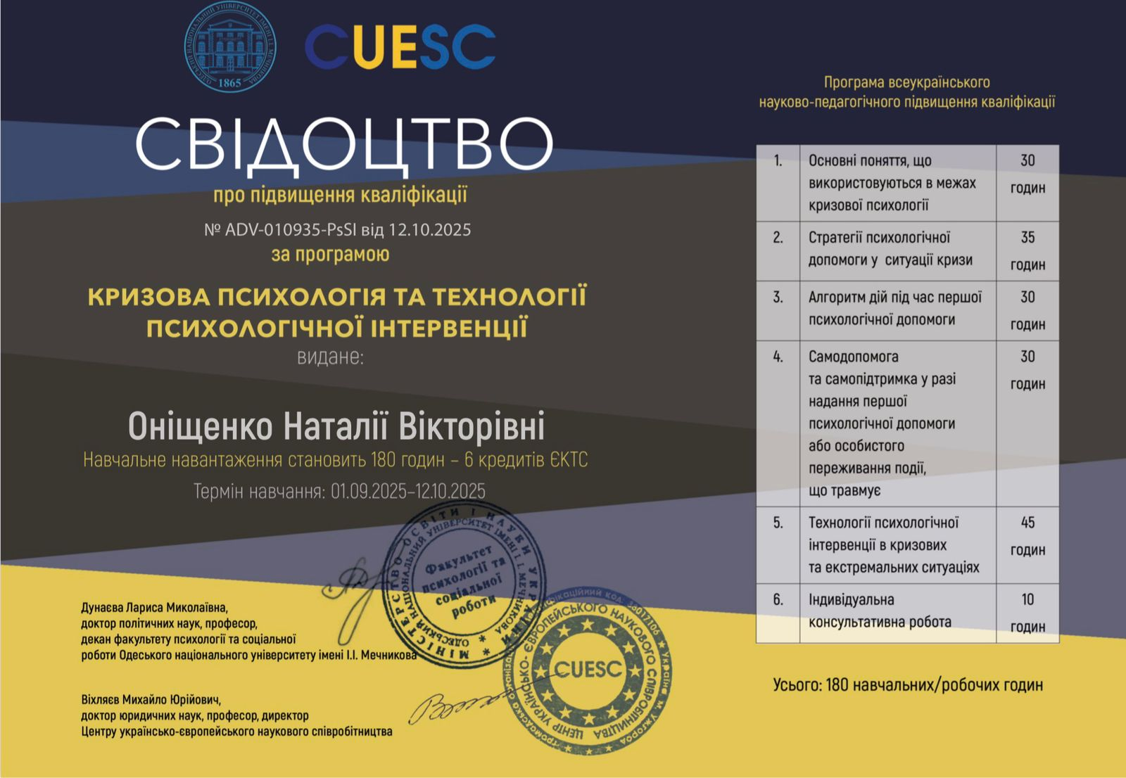 - У серпні-вересні 2025 року взяла участь у програмі всеукраїнського науково-педагогічного підвищення кваліфікації за програмою "Кризова психологія та технології психологічної інтервенції" (6 кредитів).