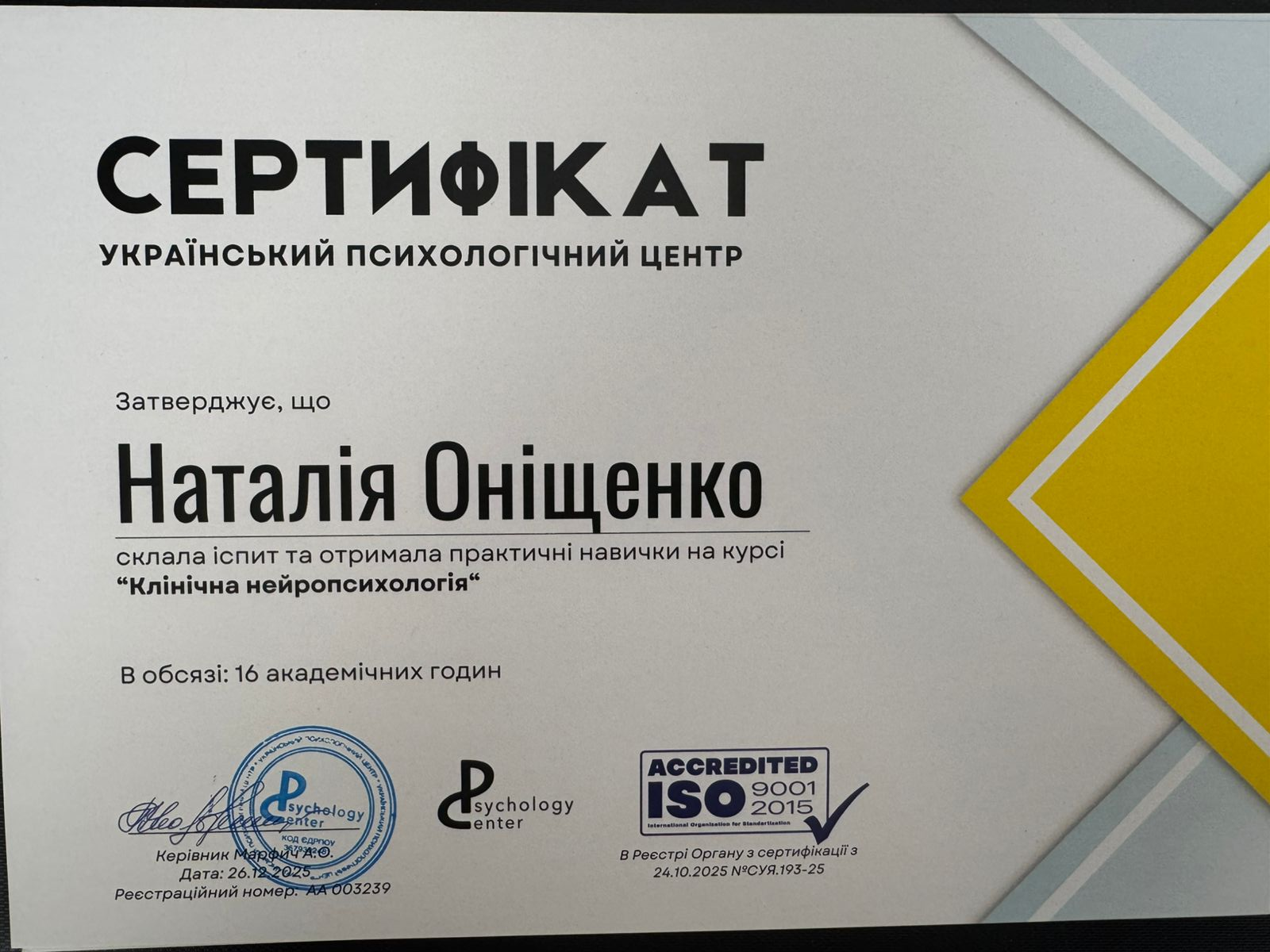 - У грудні 2025 року склала іспит та отримала практичні навички на курсі «Клінічна нейропсихологія» (0,5 кредита).