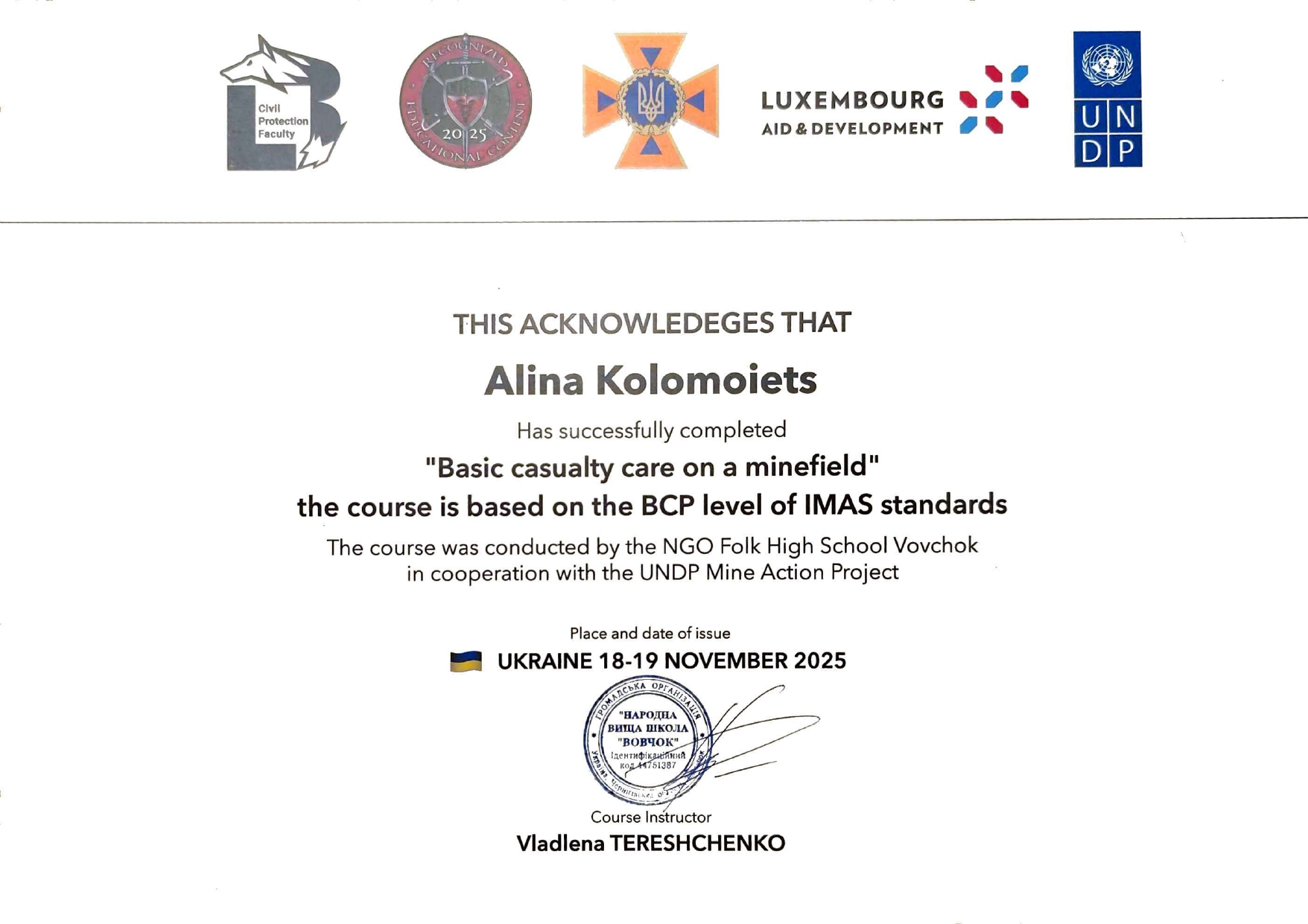 У 2025 році закінчила Національний університет цивільного захисту України та отримала освітній ступінь «Магістр» спеціальності «Психологія».