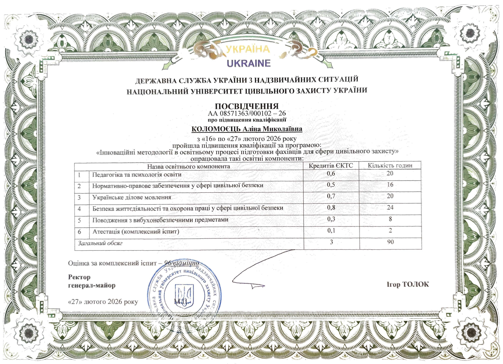У лютому 2026 року пройшла підвищення кваліфікації за програмою "Іноваційні методології в освітньому процесі підготовки фахівців для сфери цивільного захисту"