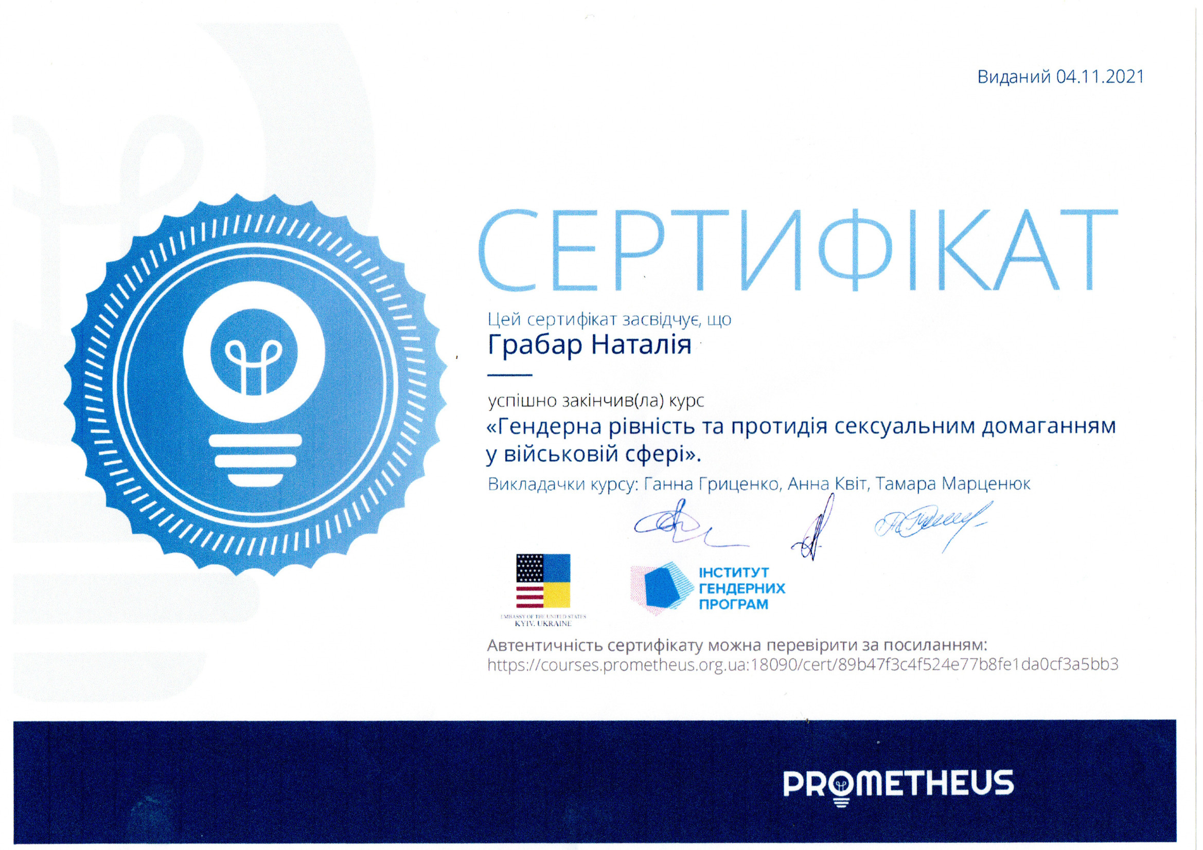 - Міжнародне підвищення кваліфікації на тему «Massive Open On-line Course (MOOC) - Tools Towards Sustainable Urbanity», проведене центром стійкого розвитку Гданського університету (CZRUG) (Польша) 2023 р. (180 год.);