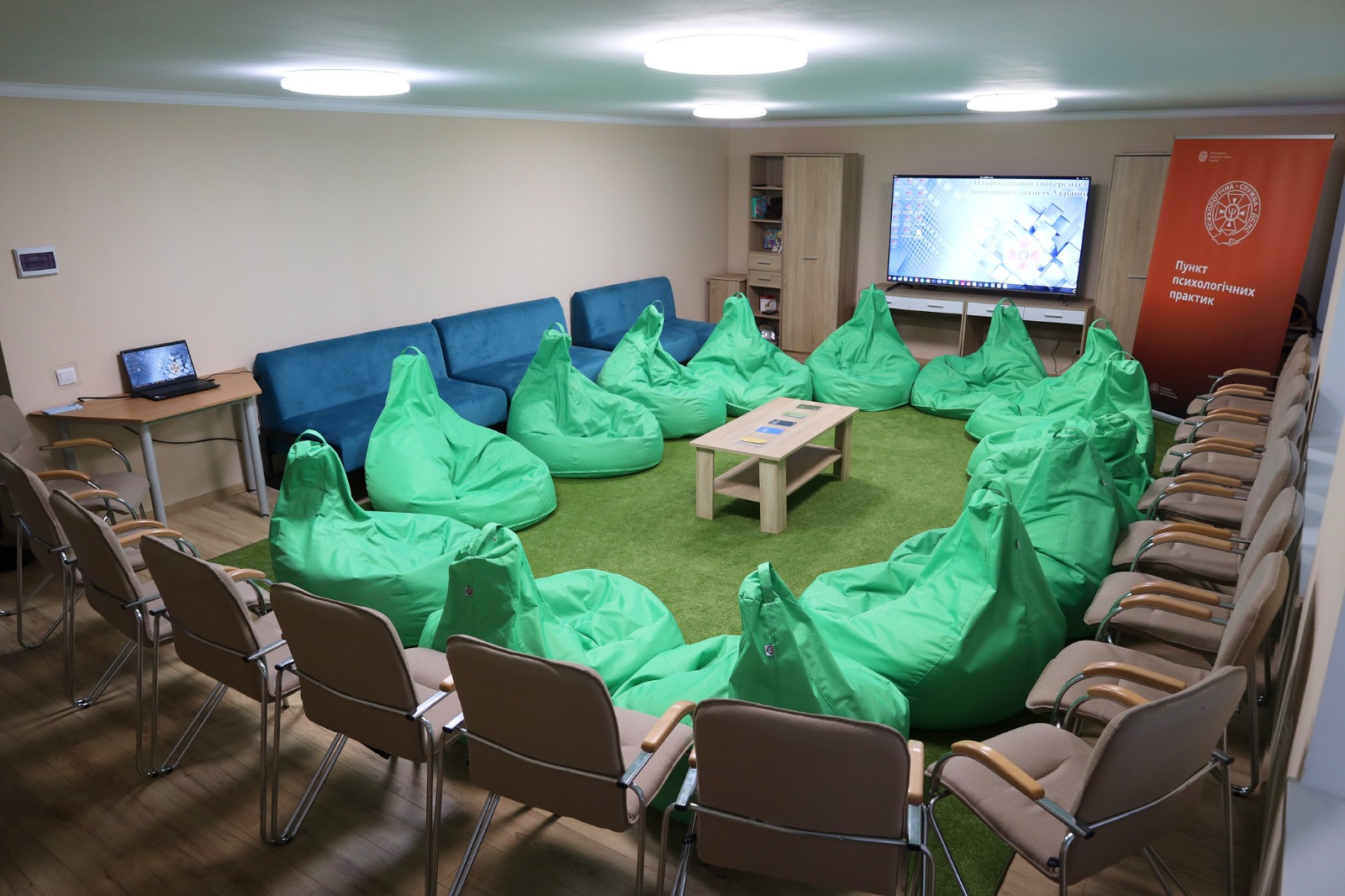 Кімната психологічного розвантаження використовується як навчальне приміщення для проведення тренінгових та релаксаційних занять, дозволяє створювати необхідний тренінговий простір.