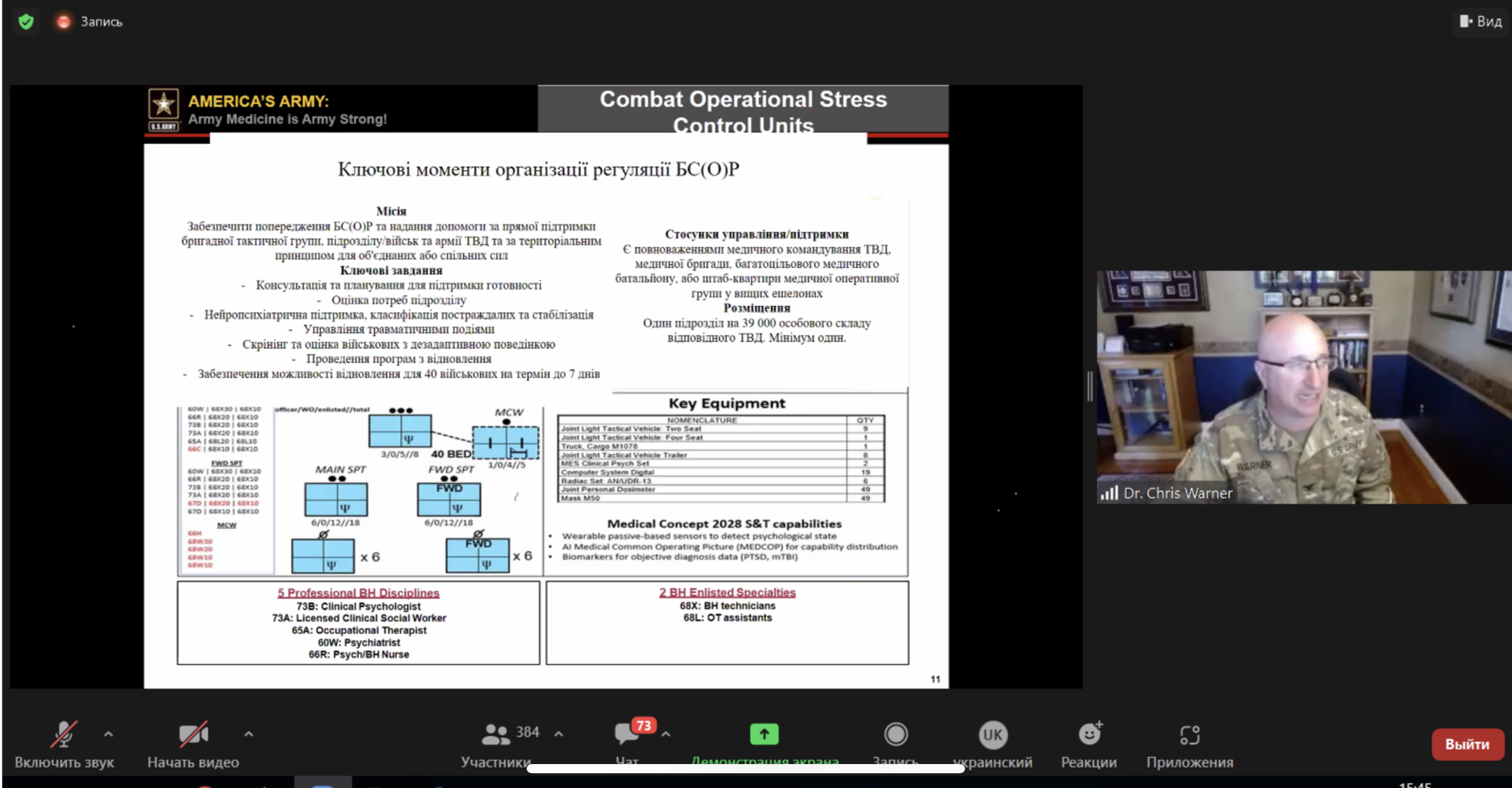 Полковник Кріс Уорнер із США в межах циклу навчальних заходів для військових та цивільних психологів, які надають послуги діючим військовослужбовцям та ветеранам провів заняття на тему: «Контроль бойового та оперативного стресу (COSC)»