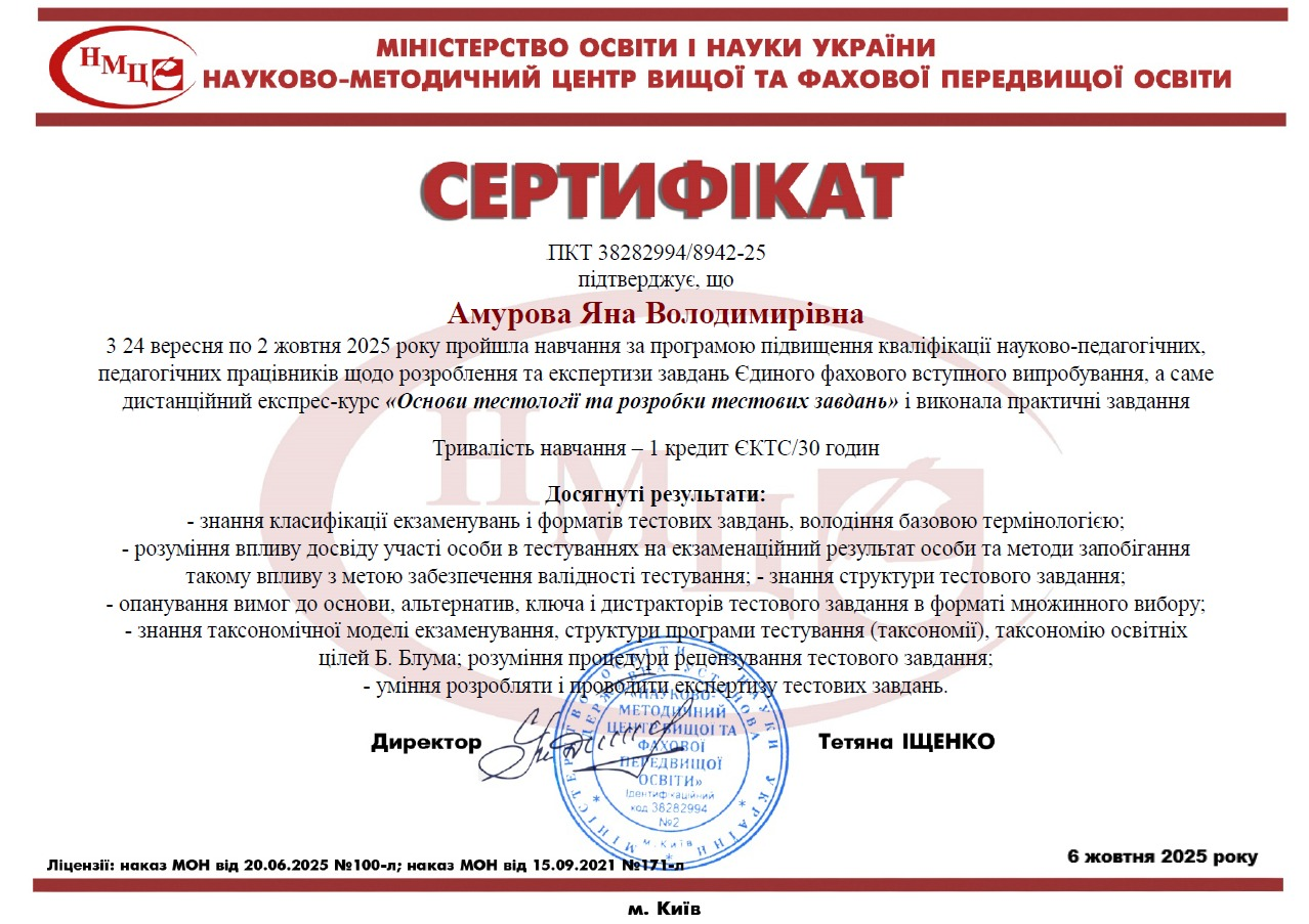 3 24 вересня по 2 жовтня 2025 року пройшла навчання за програмою підвищення кваліфікації науково-педагогічних, педагогічних працівників щодо розроблення та експертизи завдань Єдиного фахового вступного випробування, а саме дистанційний експрес-курс «Основи тестології та розробки тестових завдань» і виконала практичні завдання.