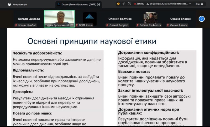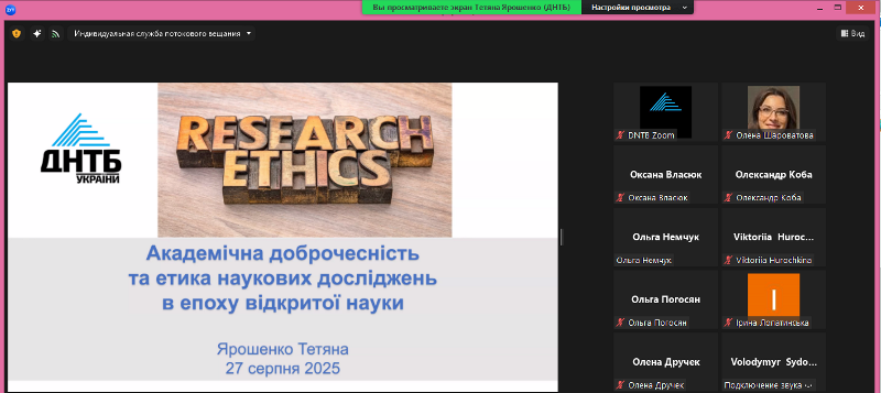 Організований Державною науково-технічною бібліотекою України, вебінар охопив актуальні теми сучасної наукової практики: етику використання штучного інтелекту в дослідженнях, питання конфіденційності та захисту персональних даних у відкритих наукових проектах, а також механізми забезпечення прозорості та відтворюваності результатів досліджень. Окремо розглядались роль та функції Комітету з етики наукових досліджень (IRB - Institutional Review Board) у забезпеченні етичних стандартів, процедури отримання етичного дозволу для досліджень з участю людей, а також адаптації традиційних етичних процедур до вимог відкритої науки та міжнародної співпраці.