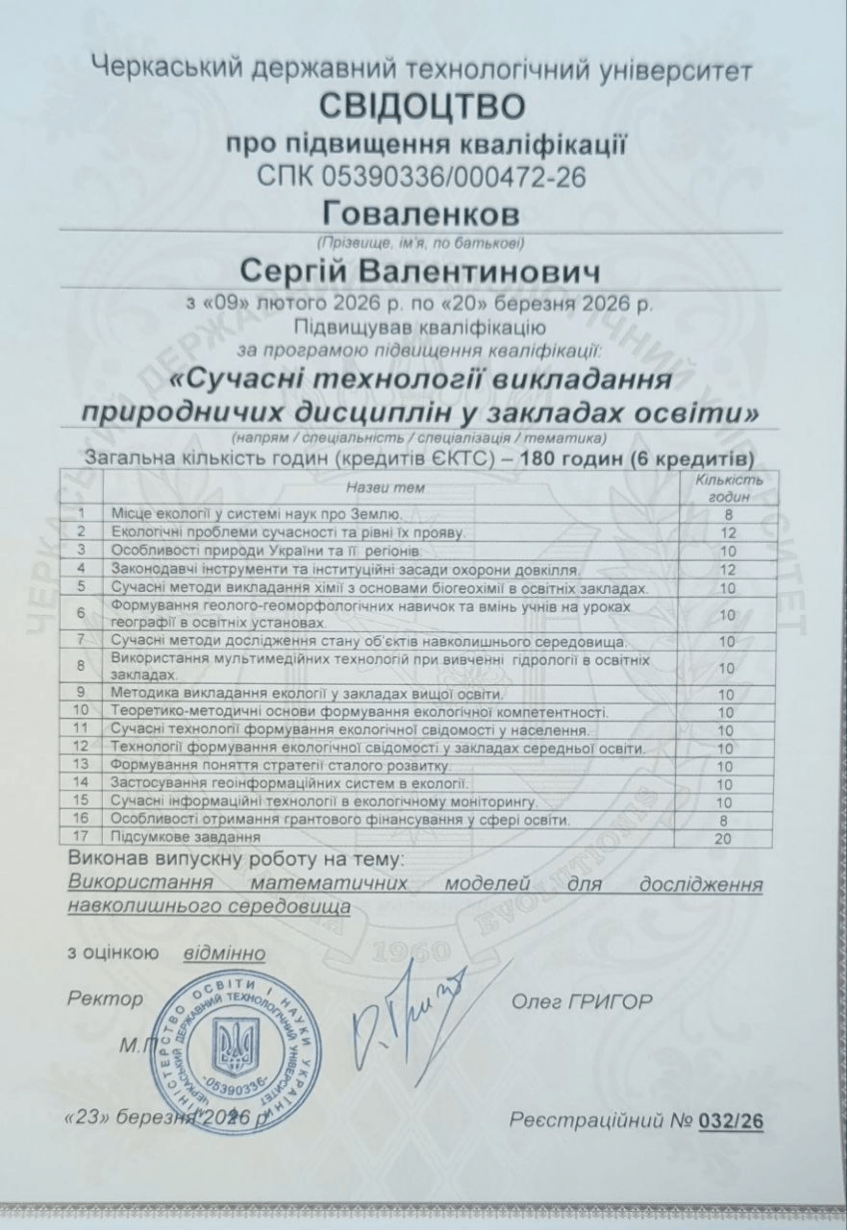 Підвищував кваліфікацію за програмою підвищення кваліфікації «Сучасні технології викладання природничих дисциплін у закладах освіти». Загальна кількість годин (кредитів ЄКТС) – 180 годин (6 кредитів).