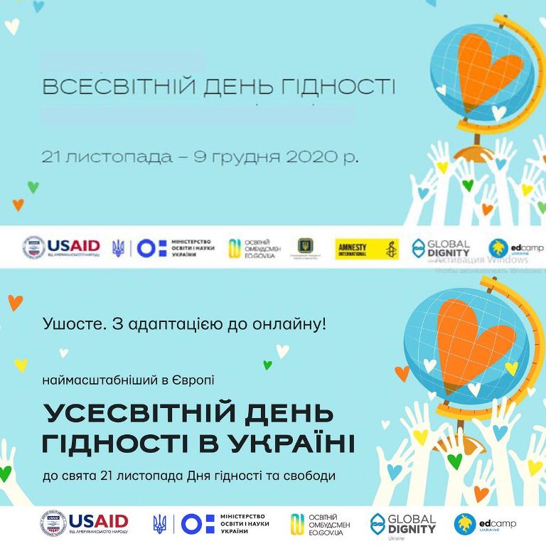 За сприяння проєкту USAID «Підтримка організацій-лідерів у протидії корупції в Україні ВзаємоДія», всесвітнього руху Amnesty International, у співпраці з Міністерством освіти і науки України, Офісом освітнього омбудсмена України й Уповноваженим Президента України з прав дитини цьогоріч Усесвітній День Гідності в Україні проводиться вже вшосте, з адаптацією до онлайну.