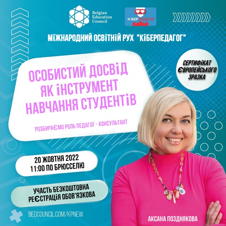Серед онлайн-заходів Міжнародного освітнього руху «Кіберпедагог» (#Кіберпедагог / #Киберпедагог) відбувся наступний майстер-клас «Особистий досвід як інструмент навчання студентів», що розкрив особливості викладацької діяльності з позицій консультування. Спікерка Аксана Позднякова надала ряд порад, як сформувати у студентства необхідний рівень довіри і прагнення навчатись, обираючи доречні для тематики консультацій місця, використовуючи кейс-стаді, сторітеллінг, особистий життєвий досвід тощо.