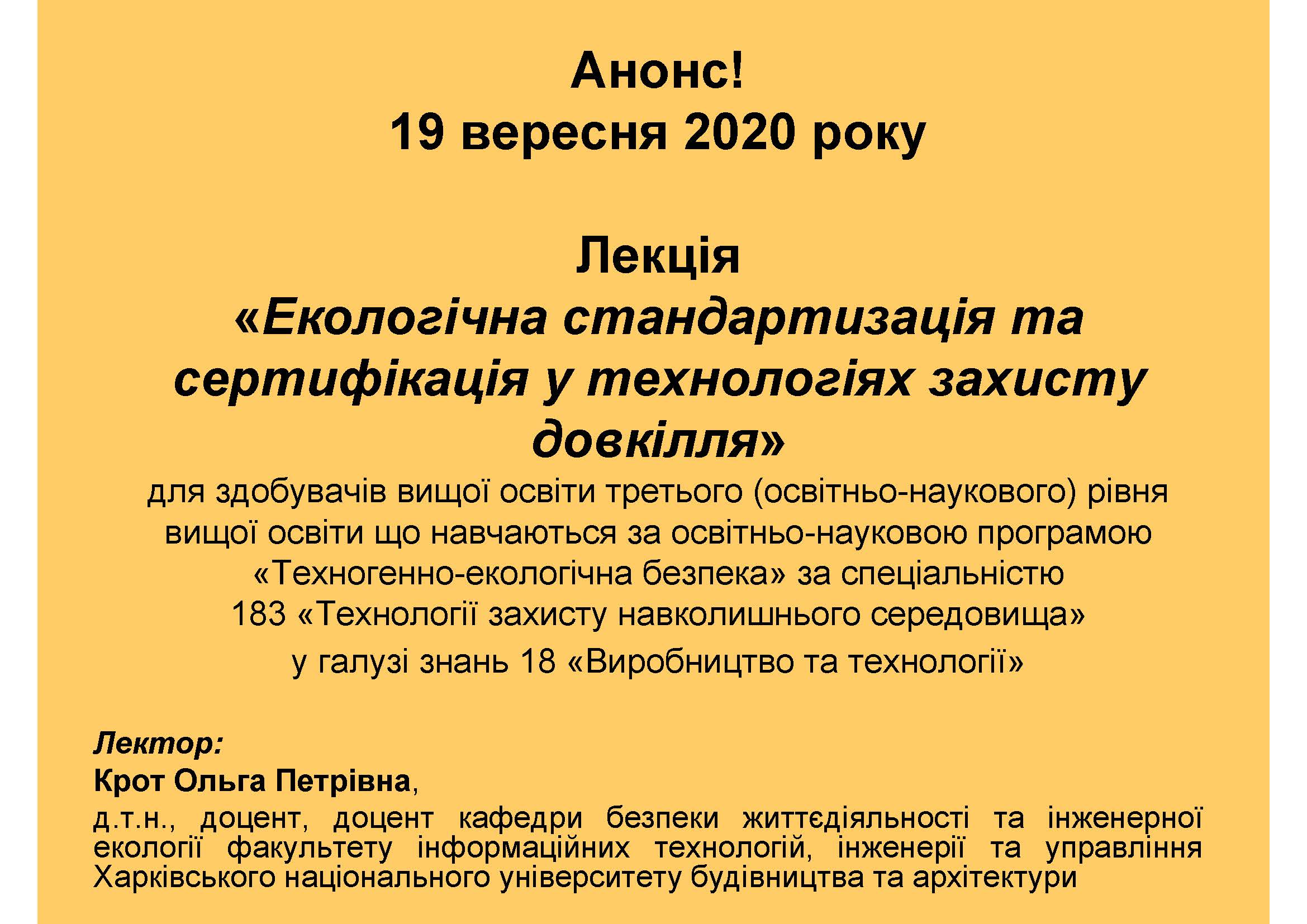 Ольга Крот, доктор технічних наук, доцент, доцент кафедри безпеки життєдіяльності та інженерної екології факультету інформаційних технологій, інженерії та управління Харківського національного університету будівництва та архітектури розпочала серію запланованих лекцій запрошених стейкхолдерів освітньо-наукової програми «Техногенно-екологічна безпека» на кафедрі прикладної механіки та технологій захисту навколишнього середовища. Стейкхолдерка спеціалізується на питаннях екологічної стандартизації та сертифікації.