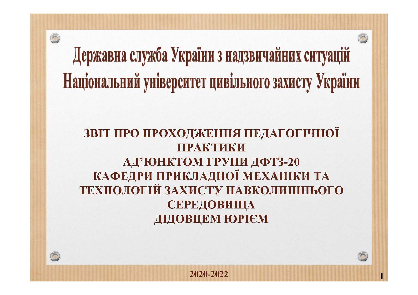 У період з 28.11.2022 р. по 11.12.2022 р. відповідно до навчального плану здобувач вищої освіти третього (освітньо-наукового) рівня Юрій ДІДОВЕЦЬ (ад’юнкт 3-го року денної форми навчання, спеціаліст цивільного захисту, майор служби цивільного захисту), який навчається за освітньо-науковою програмою «Техногенно-екологічна безпека» за спеціальністю 183 «Технології захисту навколишнього середовища» у галузі знань 18 «Виробництво та технології» опановував освітній компонент ОПН ОК 06 «Педагогічна практика», обсягом 3 кредити ЄКТС.