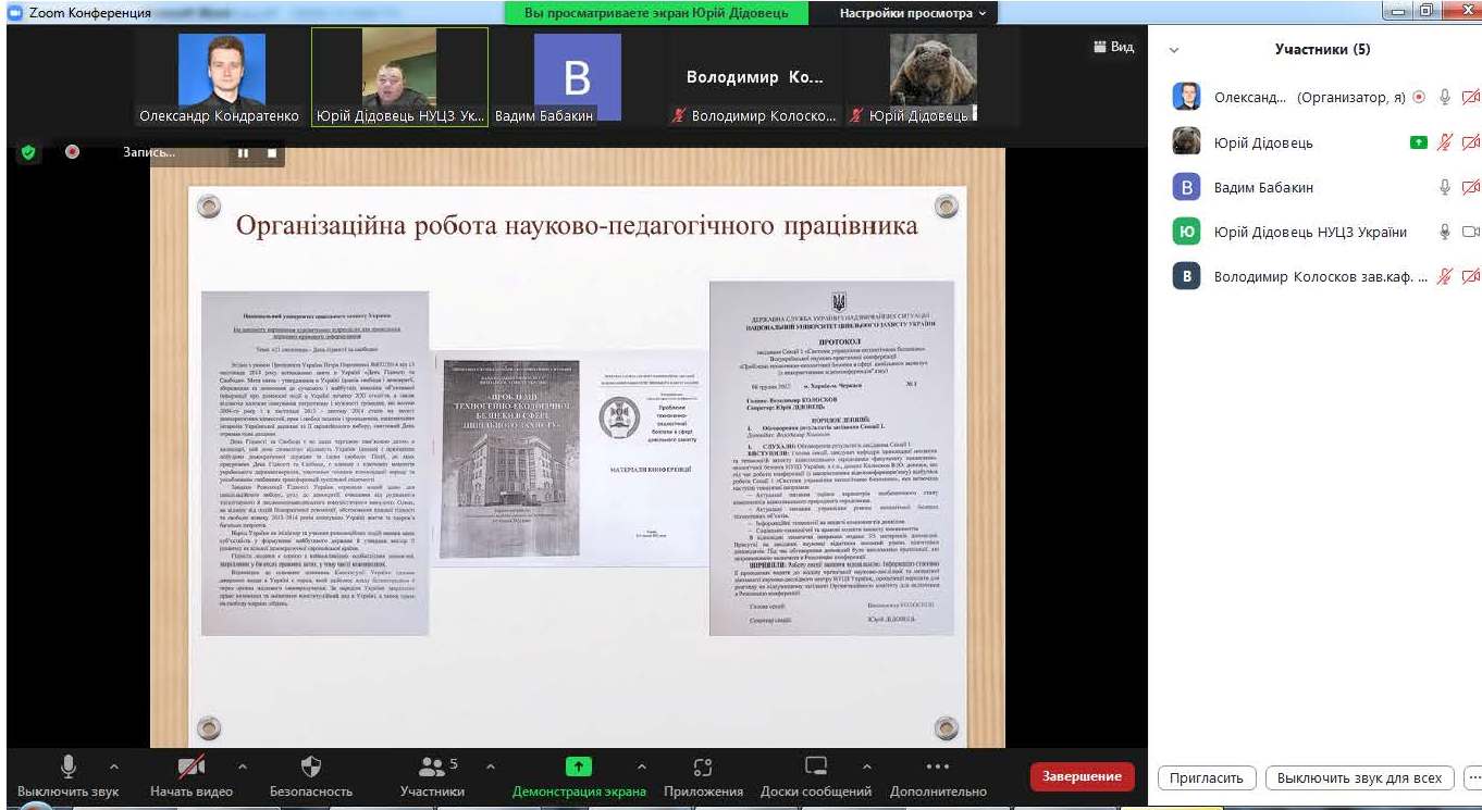 – особисту участь у пленарному засіданні Всеукраїнської науково-практичної конференції «Проблеми техногенно-екологічної безпеки в сфері цивільного захисту» (08-09 грудня 2022 р., НУЦЗ України ДСНС України) з доповіддю.