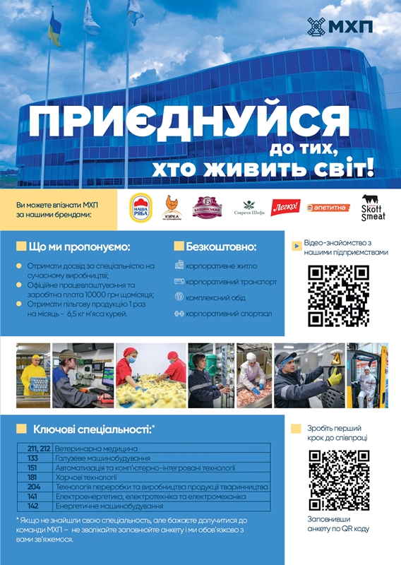 19 грудня в 14:00 запрошуємо на зустріч здобувачів вищої освіти 3 та 4 курсу бакалаврського (першого) та 1 курсу магістерського (другого) рівнів вищої освіти спеціальності 263 "Цивільна безпека", освітня програма "Охорона праці" з роботодавцем, ПрАТ "Миронівська птахофабрика", МХП, щодо переходу на дуальну форму навчання та працевлаштування на посаді інженера з охорони праці. Зустріч відбудеться в Zoom за посиланням https://us04web.zoom.us/j/6782903999?pwd=TUlIOE1JbFYrdFBLdzlTM21SR2FFZz09.