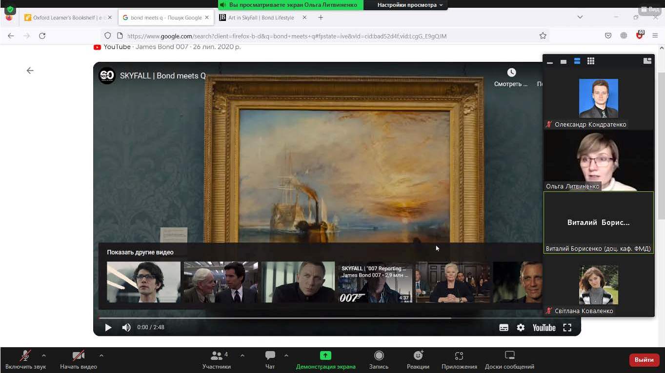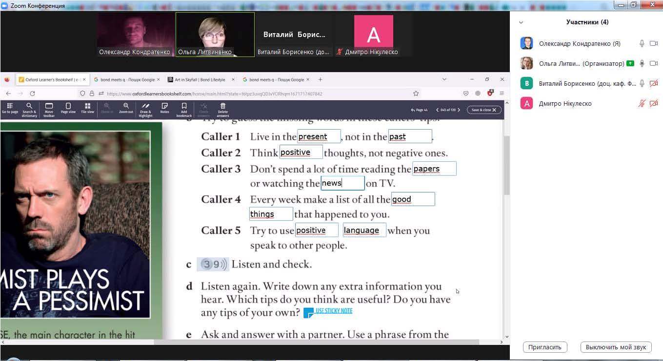 Зустріч, темами якої було «Ironic in Bondian, the saga of James Bond - agent 007» та «Positive thinking is a rule of life», відвідали здобувачі вищої освіти третього (освітньо-наукового) рівня, котрі навчаються за освітньо-науковою програмою вищої освіти «Техногенно-екологічна безпека» за спеціальністю 183 «Технології захисту навколишнього середовища» у галузі знань 18 «Виробництво та технології»: Світлана Коваленко (аспірантка 2 року денної форми навчання, магістр екології) та Дмитро Нікулеско (полковник служби цивільного захисту, ад’юнкт 1-го року заочної форми навчання, магістр пожежної безпеки). З ними підвищував свій рівень кваліфікації доцент кафедри прикладної механіки та технологій захисту навколишнього середовища, доктор технічних наук, доцент Олександр Кондратенко, гарант вказаної освітньо-наукової програми.