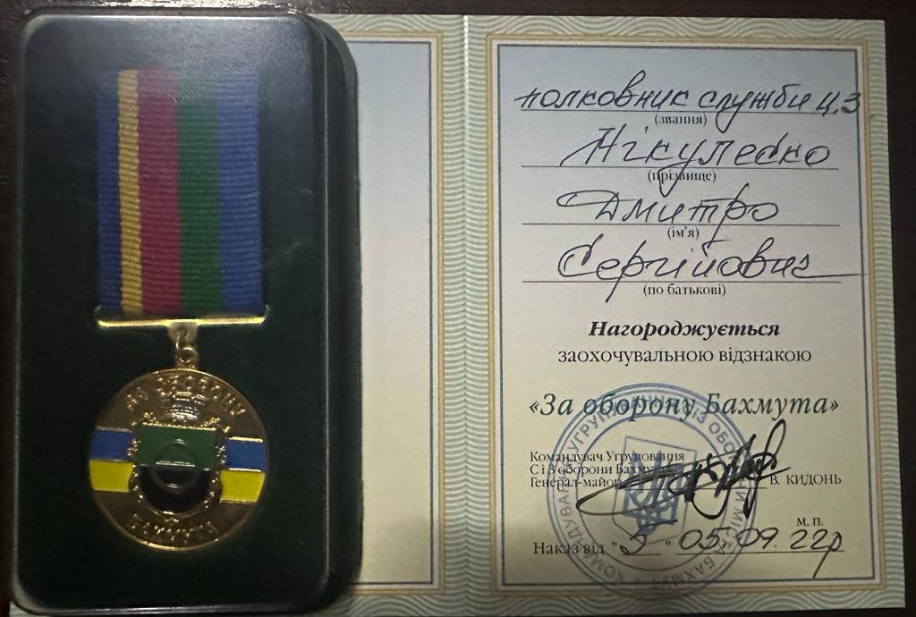– Заохочувальною відзнакою «За оборону Бахмута» (Наказ Командувача Угруповання С і З оборони Бахмута № 5 від 05.09.2022 р.).