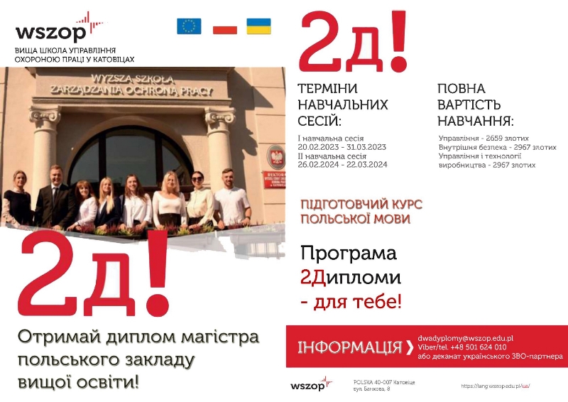 В рамках реалізації підписаних угод з Вищою школою управління охороною праці у Катовіцах оголошується набір здобувачів вищої освіти до участі у Програмі Два дипломи (ОС магістр) на 2022-2023 навчальний рік.