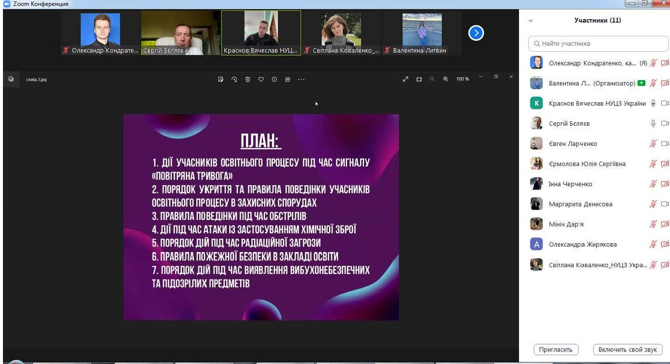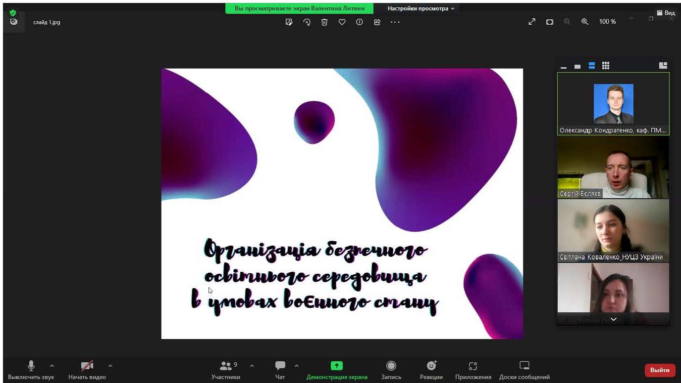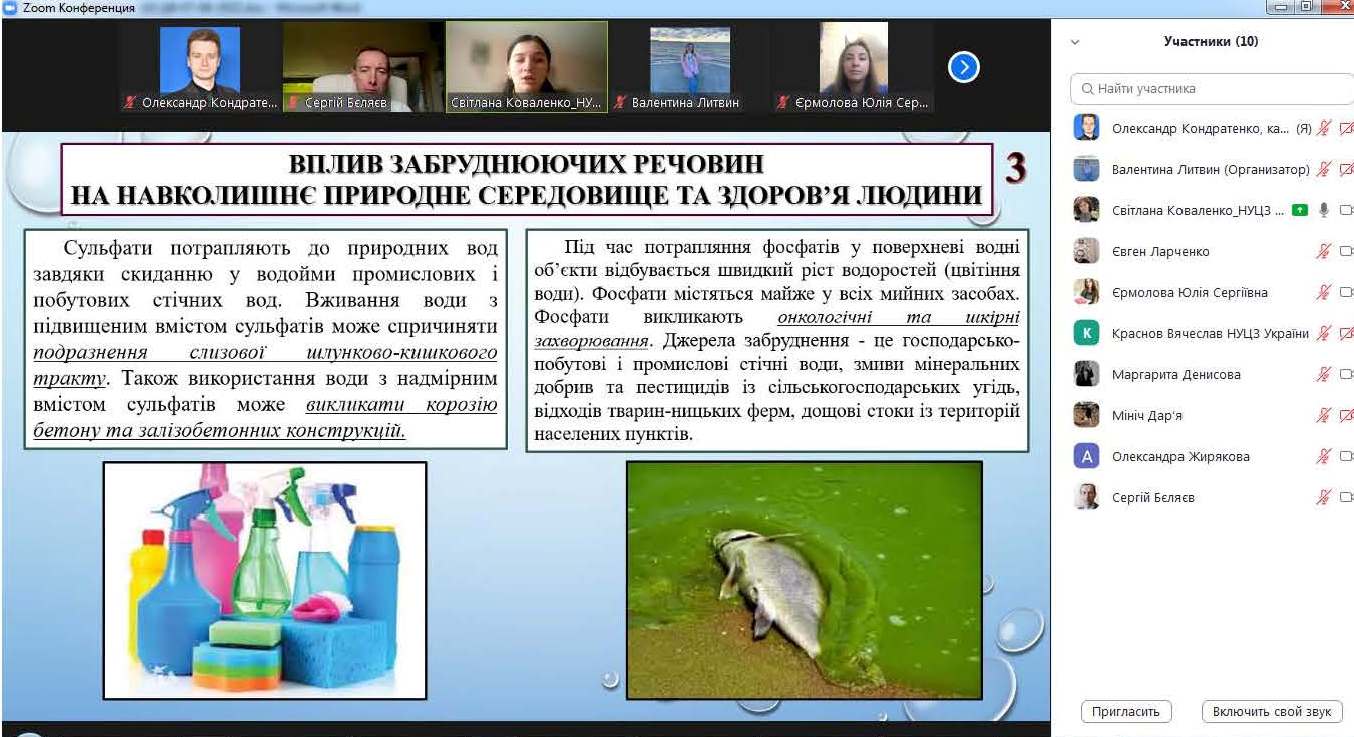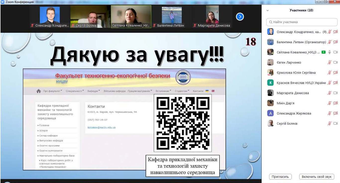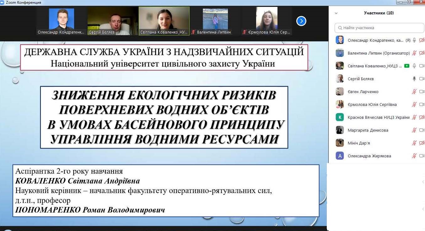 Темою лекції аспірантки 2-го року денної форми навчання, магістра екології Світлани КОВАЛЕНКО було «Зниження екологічних ризиків поверхневих водних об’єктів в умовах басейнового принципу управління водними ресурсами». Темою бесіди ад’юнкта 1-го року денної форми підготовки, магістра цивільного захисту, старшого лейтенанта служби цивільного захисту Вячеслава КРАСНОВА, була «Організація безпечного освітнього середовища в умовах воєнного стану».