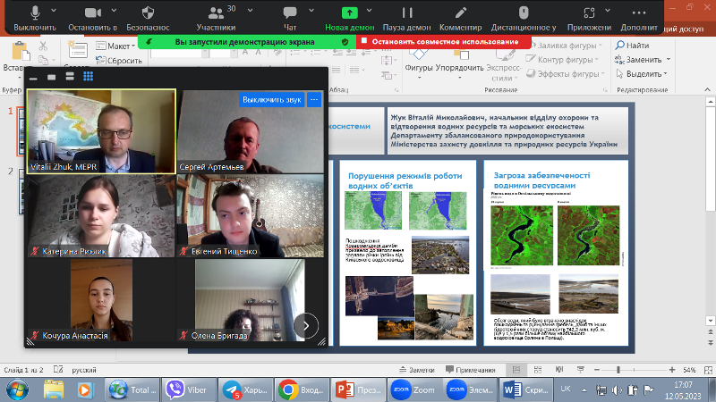 12 травня 2023 року для здобувачів вищої освіти 1-3-го курсів навчання бакалаврату та 1-го курсу магістратури, які навчаються за освітньо-професійною програмою «Екологічна безпека», начальником відділу охорони та відтворення водних ресурсів та морських екосистем Департаменту збалансованого природокористування Міністерства захисту довкілля та природних ресурсів України Віталієм Жуком було проведено лекцію за темою: «Вплив воєнних дій на водні екосистеми України».