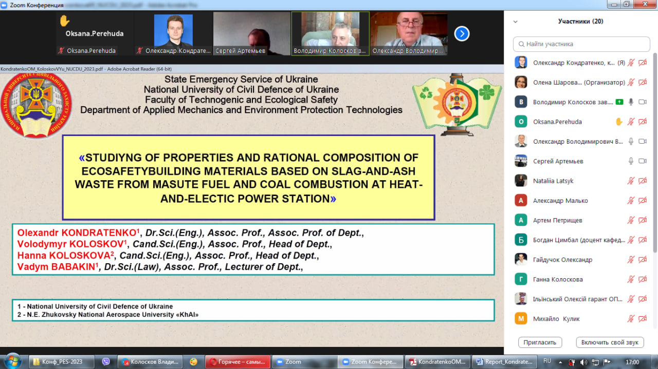– Studying of properties and rational composition of ecosafety building materials based on slag-and-ash waste from masute fuel and coal combustion at heat-and-electic power station, автори: Олександр КОНДРАТЕНКО (д.т.н., доцент, професор кафедри прикладної механіки та технологій захисту навколишнього середовища факультету техногенно-екологічної безпеки НУЦЗ України), Володимир КОЛОСКОВ (к.т.н., доцент, завідувач кафедри прикладної механіки та технологій захисту навколишнього середовища факультету техногенно-екологічної безпеки НУЦЗ України), Ганна КОЛОСКОВА (к.т.н., доцент, завідувач кафедри конструкції і проектування ракетної техніки факультету ракетно-космічної техніки Національного аерокосмічного університету ім. М.Є. Жуковського «Харківський авіаційний інститут»), Вадим БАБАКІН (д.ю.н., доцент, викладач кафедри прикладної механіки та технологій захисту навколишнього середовища факультету техногенно-екологічної безпеки НУЦЗ України);