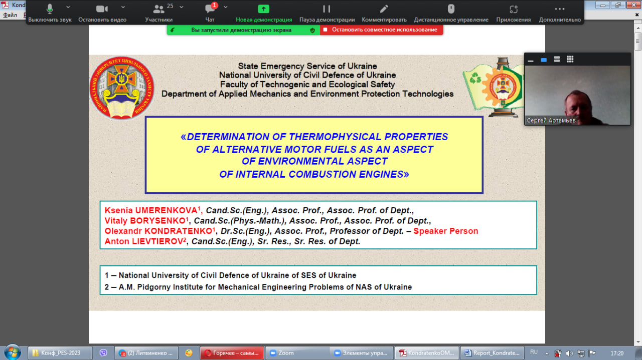 – Determination of thermophysical properties of alternative motor fuels as an aspect of environmental aspect of internal combustion engines, автори: Ксенія УМЕРЕНКОВА (к.т.н., доцент, викладач кафедри фізико-математичних дисциплін факультету техногенно-екологічної безпеки НУЦЗ України), Віталій БОРИСЕНКО (к.ф.-м.н., доцент, доцент кафедри фізико-математичних дисциплін факультету техногенно-екологічної безпеки НУЦЗ України), Олександр КОНДРАТЕНКО (д.т.н., доцент, професор кафедри прикладної механіки та технологій захисту навколишнього середовища факультету техногенно-екологічної безпеки НУЦЗ України), Антон ЛЄВТЄРОВ (к.т.н., с.н.с., с.н.с. відділу водневої енергетики Інституту проблем машинобудування ім. А.М. Підгорного НАН України).