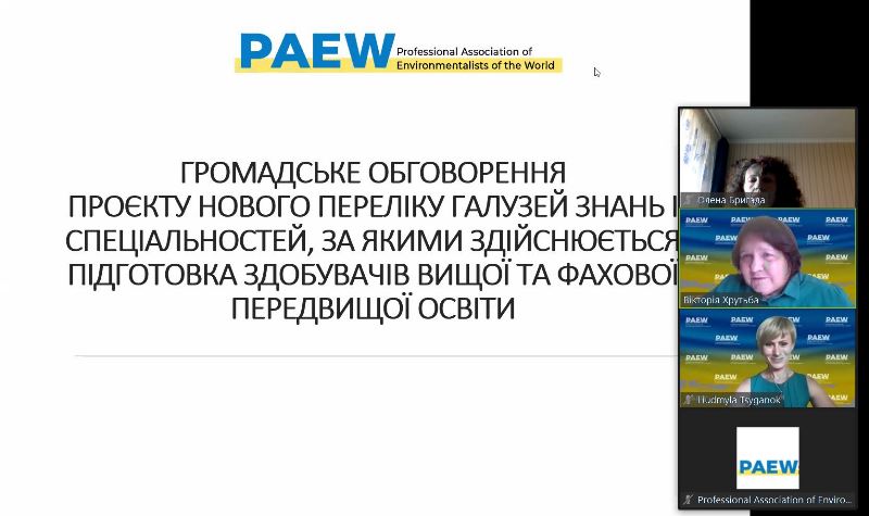 17.08.2023 р. відбулося розширене он-лайн засідання Асоціації професіоналів довкілля/Professional Association of Environmentalists of the World (PAEW) з провідними фахівцями в екологічній сфері щодо обговорення Проєкту нового переліку галузей знань і спеціальностей, в якому взяли участь гаранти ОП «Екологічна безпека» першого та другого рівнів вищої освіти – Олексій ІЛЬЇНСЬКИЙ та Олена БРИГАДА. Захід об’єднав всю національну еліту екологічної освіти і науки: представників ЗВО, що готують екологів, представників Міністерства освіти і науки України, народних депутатів, громадських діячів, науковців, роботодавців, здобувачів вищої освіти тощо. Були присутні майже 180 фахівців.Зустріч актуалізувала та відокремила деякі проблемні питання спеціальності 101 «Екологія», Класифікатора професій, які потребують вирішення, а також необхідності екологічній спільноті більш тісно комунікувати та конструктивно співпрацювати. Питання екологічної безпеки у нашій країні все більше набувають надзвичайної актуальності через екоцид, що спричиняють військові дії росії в Україні, та негативні наслідки для довкілля усього світу. Отже, якісна екологічна освіта та висококваліфіковані фахівці-екологи – це шлях до сталого розвитку не тільки нашої країни, але й усього світу!