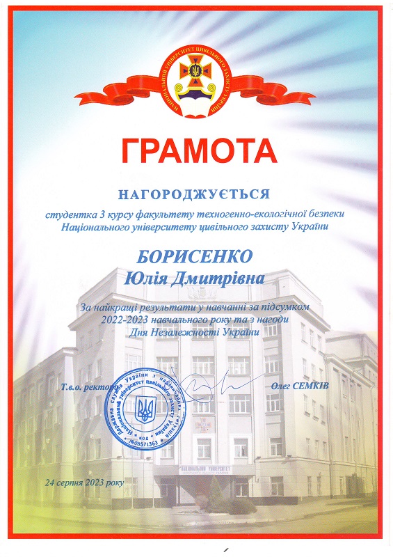За найкращі результати у навчанні за підсумком 2022-2023 навчального року та з нагоди Дня Незалежності України Грамотою за підписом т.в.о. ректора Національного університету цивільного захисту України Олега СЕМКІВА нагороджено Юлію БОРИСЕНКО, студентку 3 курсу факультету техногенно-екологічної безпеки, що навчається за освітньою програмою "Техногенно-екологічна безпека".