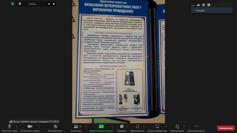 09 вересня 2023 р. доцентом кафедри охорони праці та техногенно-екологічної безпеки Цимбалом Богданом Михайловичем для здобувачів вищої освіти, які навчаються за освітньо-професійною програмою «Охорона праці», спеціальності 263 «Цивільна безпека», на другому (магістерському) рівня вищої освіти були проведені он-лайн лабораторні роботи.
