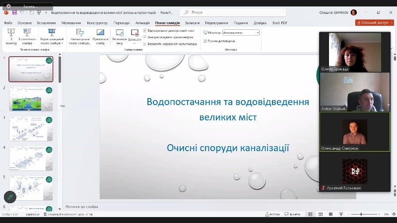 06.10.2023 р. за запрошенням доцента кафедри ОП та ТЕБ Олени БРИГАДИ для здобувачів вищої освіти, що навчаються за першим (бакалаврським) та другим (магістерським) рівнем вищої освіти за освітньо-професійними програмами «Екологічна безпека», інженером з водопостачання та водовідведення ТОВ «iC CONSULENTEN», iCUkraine, співзасновником НПГО «Watersector», к.т.н. Олександром СМИРНОВИМ проведено заняття на тему: «Водопідготовка та водовідведення великих міст. Очисні споруди каналізації».