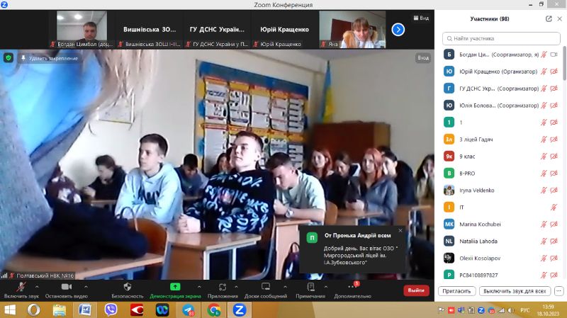 18 жовтня 2023 року, доцент кафедри охорони праці та техногенно-екологічної безпеки Цимбал Богдан Михайлович, прийняв учать в онлайн-зустрічі із директорами/заступниками директорів закладів загальної середньої освіти Полтавської області, а також старшокласниками (випускники 2024), які зацікавлені в здобутті спеціальностей у галузі знань  «Цивільна безпека», а також навчатися за освітньо-професійними програмами «Охорона праці», «Екологічна безпека» та «Технологія захисту навколишнього середовища».
