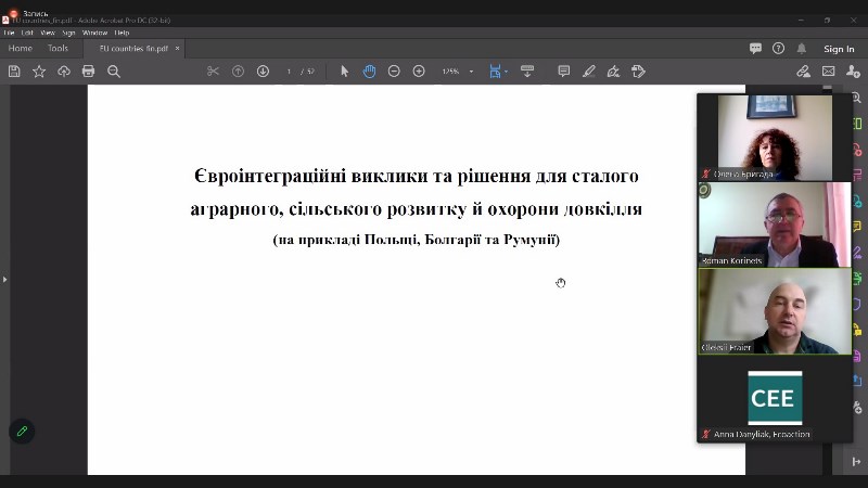 Доповідачі зробили акцент на тому, що процесі відновлення та євроінтеграції тісно пов’язані між собою та здатні створити синергію для сталого майбутнього нашої країни. На думку експертів, які прийняли участь в обговоренні, невід’ємною частиною відбудови нашої країни є екологізація економіки. Це пов’язано з одного боку з вимогами ЄС для аграрного сектору, який залишається рушійною силою української економіки (навіть під час війни), з іншого боку саме цей сектор економіки потребує значної трансформації, яка забезпечить його екологічно сталий розвиток. Доповідачі поділилися своїми дослідженнями щодо досвіду Польщі, Румунії та Болгарії в питаннях екологізації агровиробництва в процесі їх вступу до ЄС. Велику увагу було приділено саме сучасним викликам, які виникають у цих країнах на шляху до сталого аграрного та сільського розвитку.