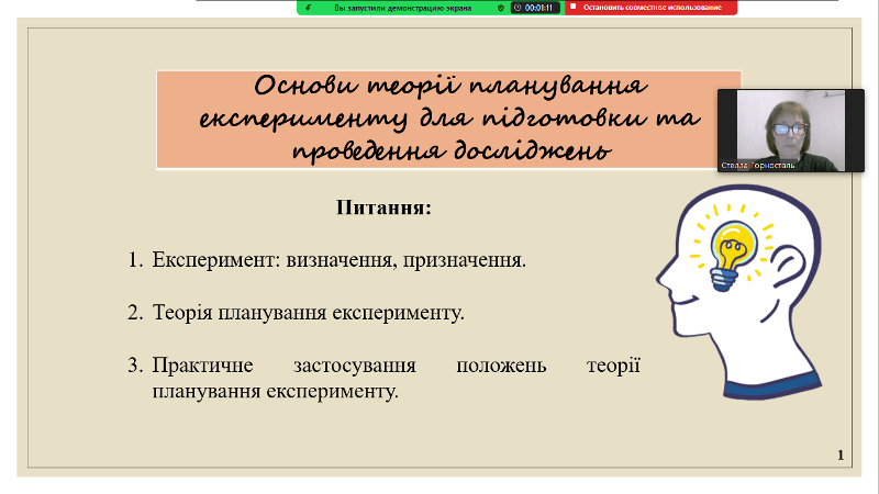 Метою доповіді було донести до молодих науковців думку про необхідність зважено підходити до проведення експерименту, спиратися на сучасні підходи та дотримуватися положень академічної доброчесності. Доповідачка на прикладі показала особливості застосування теорії планування експерименту, її можливості та переваги.