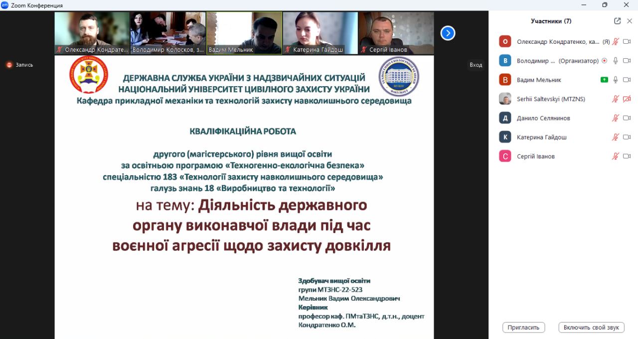 Також до складу комісії екзаменаційної входили Володимир КОЛОСКОВ, завідувач кафедри, гарант ОПП «Техногенно-екологічна безпека» за другим рівнем, к.т.н., доцент, Вадим БАБАКІН, викладач кафедри, д.ю.н., доцент.