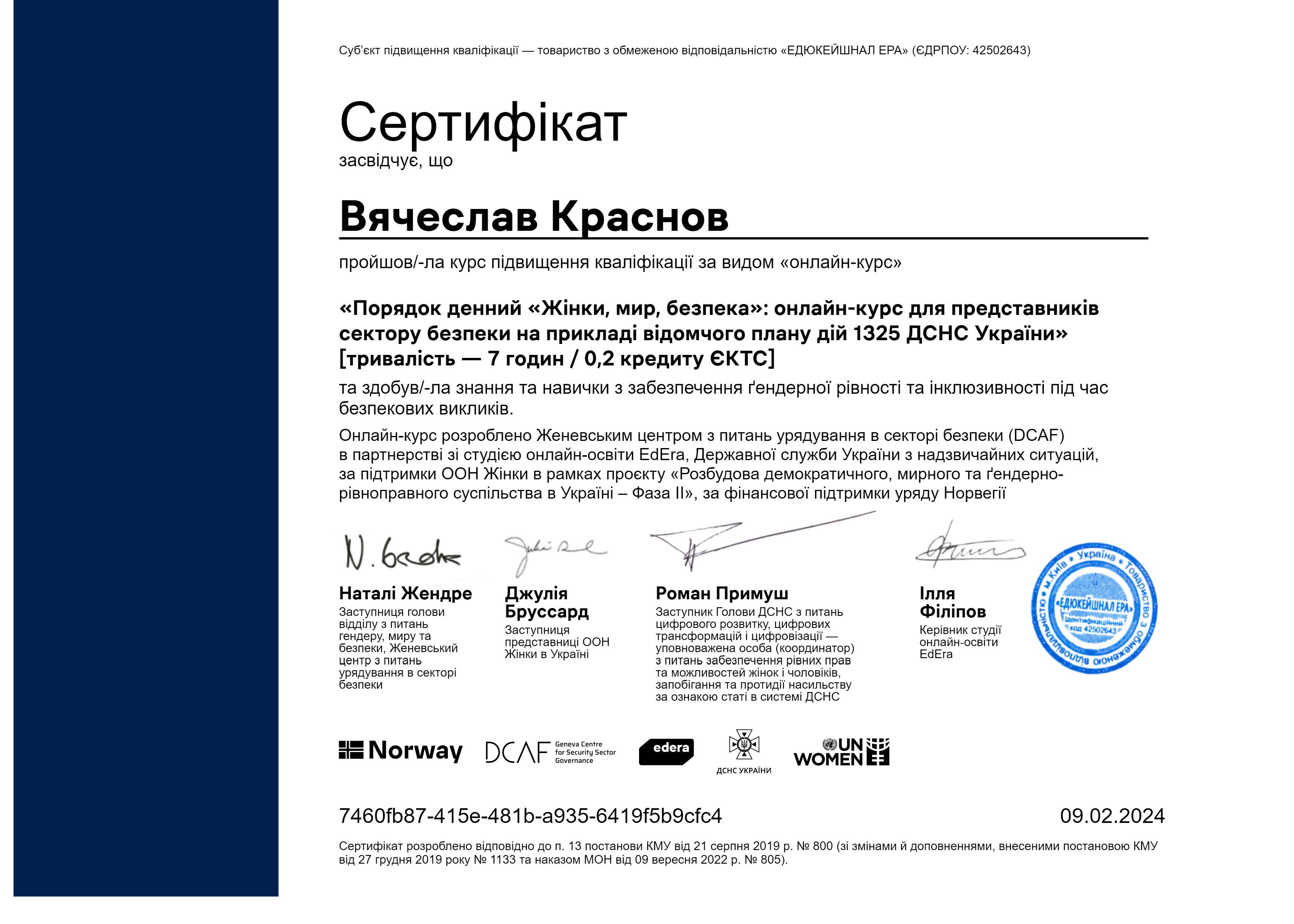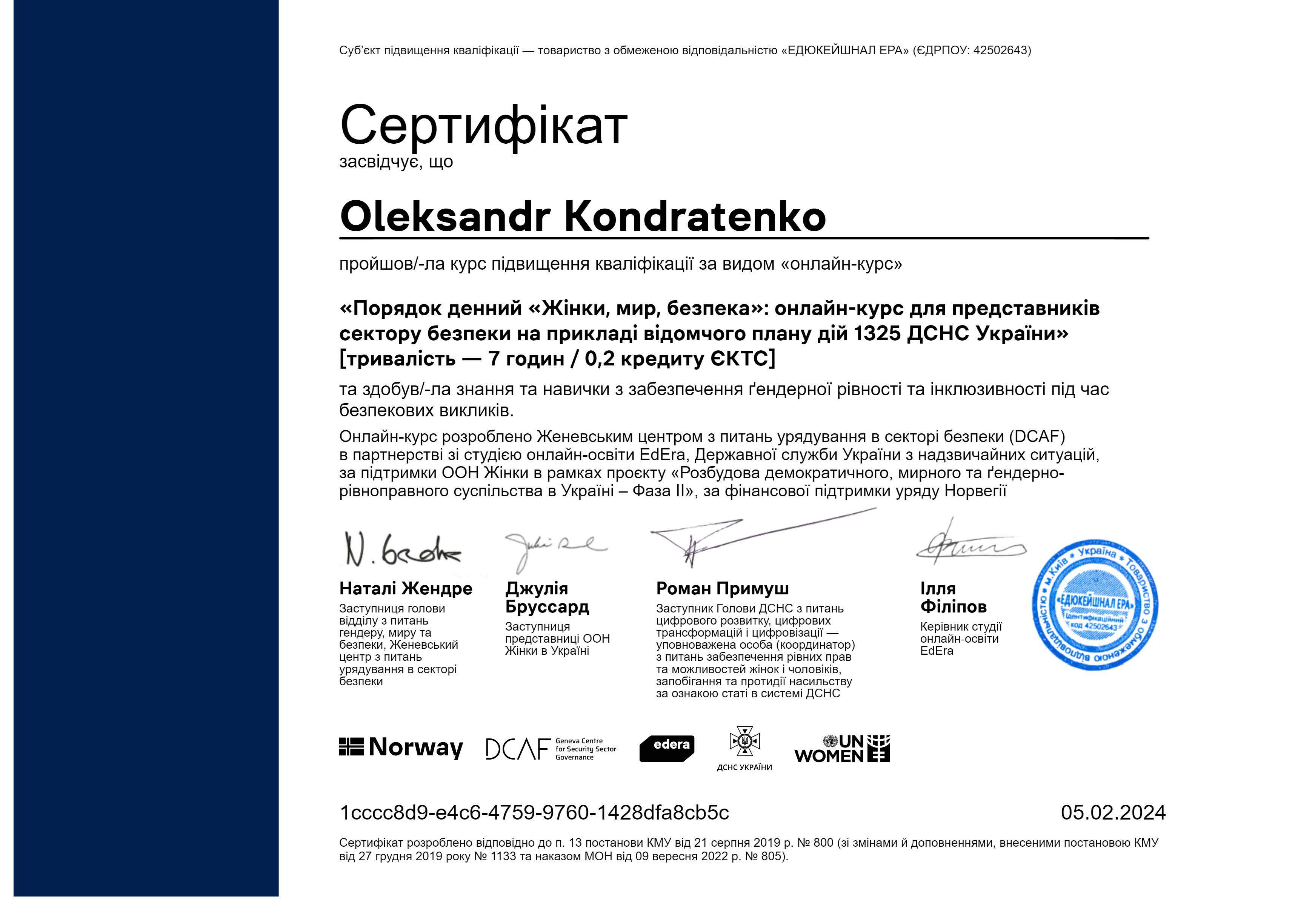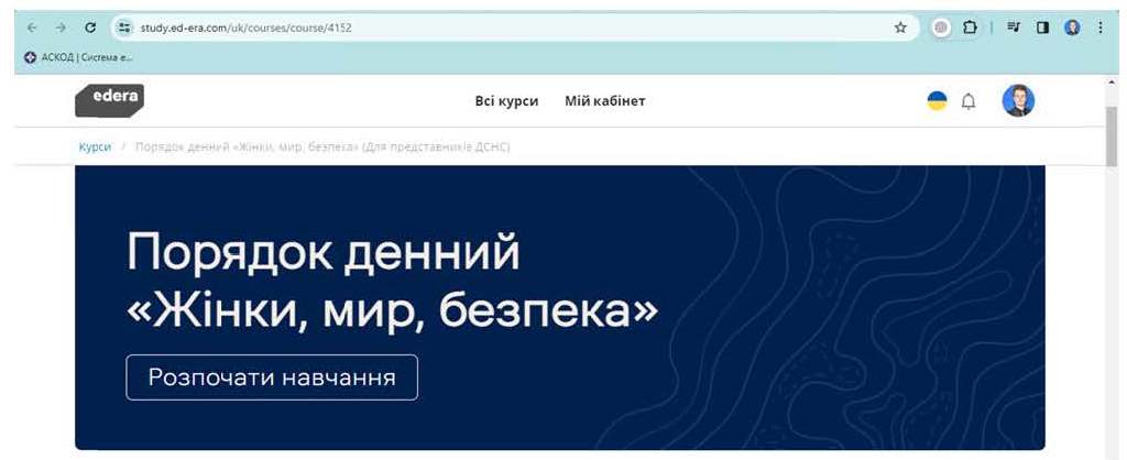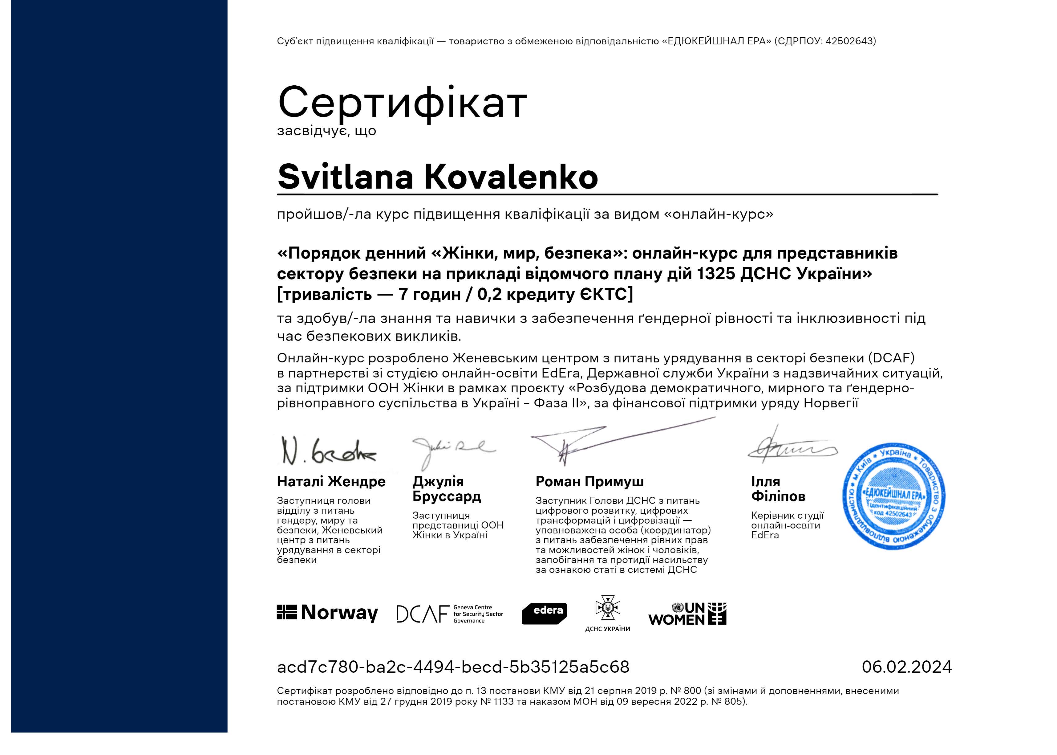 Відповідно до окремого доручення ДСНС від 06.12.2023 року № В-1060 «Про проходження онлайн-курсу на платформі студії онлайн-освіти EdEra» з метою реалізації завдань Національного плану дій України з виконання резолюції Ради Безпеки ООН 1325 «Жінки, мир, безпека» на період до 2025 року на кафедрі прикладної механіки та технологій захисту навколишнього середовища організовано підвищення рівня кваліфікації здобувачів третього (освіто-наукового рівня) вищої освіти за освітньо-науковою програмою вищої освіти «Техногенно-екологічна безпека» спеціальності 183 «Технології захисту навколишнього середовища» у галузі знань 18 «Виробництво та технології».