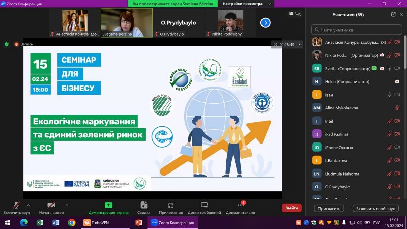 15 лютого 2024 року НПП кафедри ОП та ТЕБ Олена БРИГАДА та Антон МАЦАК разом зі здобувачами вищої освіти навчальної групи ЕК-21-532 прийняли участь у онлайн семінарі «Екологічне маркування та єдиний зелений ринок з ЄС». Програма семінару включала найактуальніші питання: