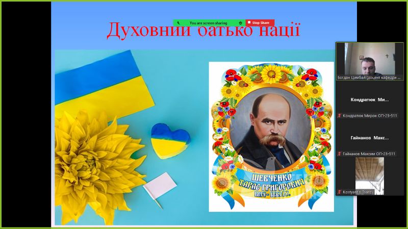 9 березня 2024 р., доцент кафедри ОПтаТЕБ Цимбал Богдан провів кураторську годину за темою: «Заповіт Тараса: Борітеся – поборете! 210 років від дня народження Тараса Григоровича Шевченка».