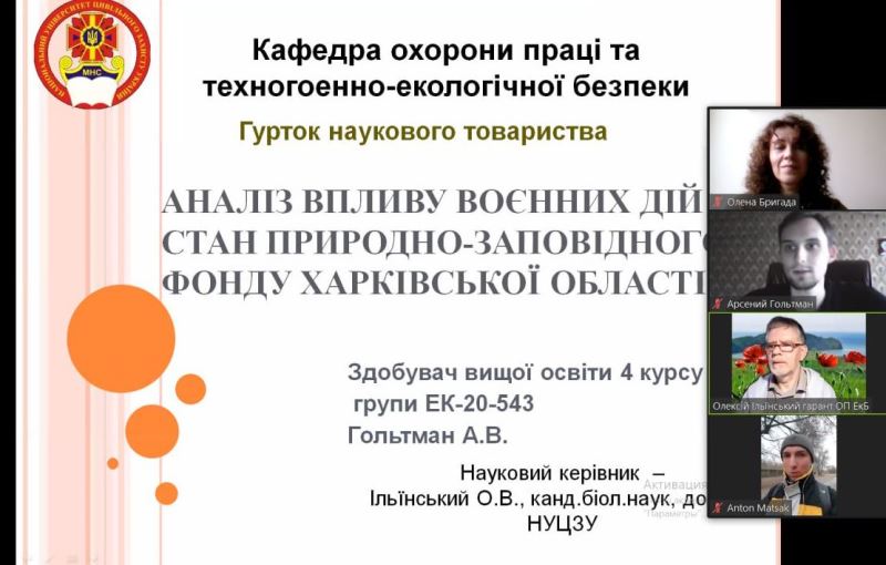Доповідачем виступив здобувач 4 курсу гр. Ек-20-543 Арсеній Гольтман з презентацією на тему «Аналіз впливу воєнних дій на стан природно-заповідного фонду Харківської області». Було розглянуто також широке коло питань, пов’язаних також з іншими аспектами впливу воєнних дій на довкілля та прогнозування стану в період рекреації. Доповідь викликала жваве обговорення присутніх, було викладено додаткові факти впливу на довкілля. Зокрема, керівником гуртка Олексієм Ільїнським було надано відеоматеріали щодо результатів роботи екологів в Херсонській області з контролю наслідків підриву дамби Каховської ГЕС.