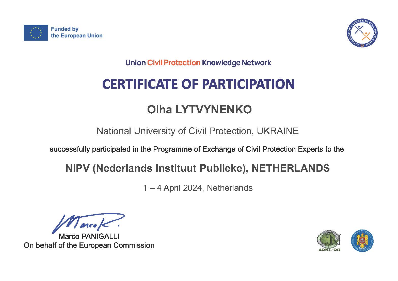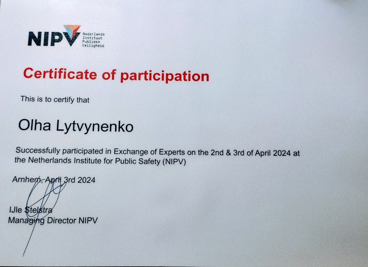 – Programme of Exchange of Civil Protection Experts to the NIPV, 01–04 квітня 2024 р., Netherlands Institute for Public Safety, Arnhem, Netherlands.
