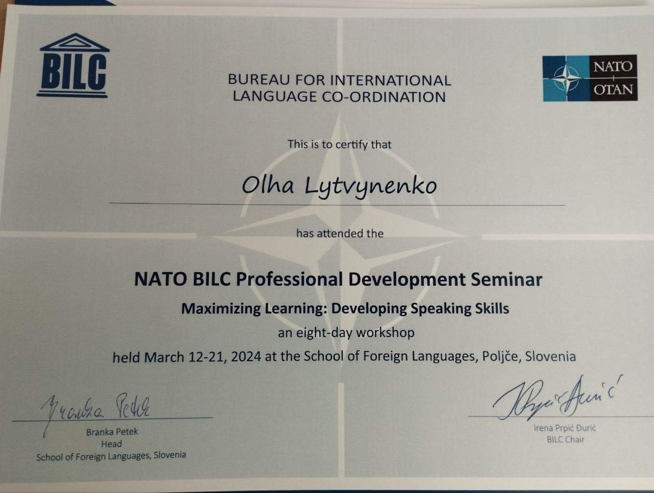 – NATO BILC Professional Development Seminar «Maximizing learning: Development speaking skills. An 8-day workshop», 12–21 березня 2024 р., School of Foreign Languages, Poljce, Slovenia;
