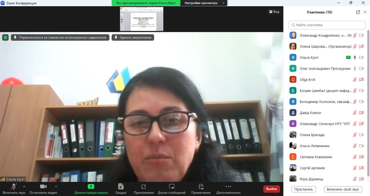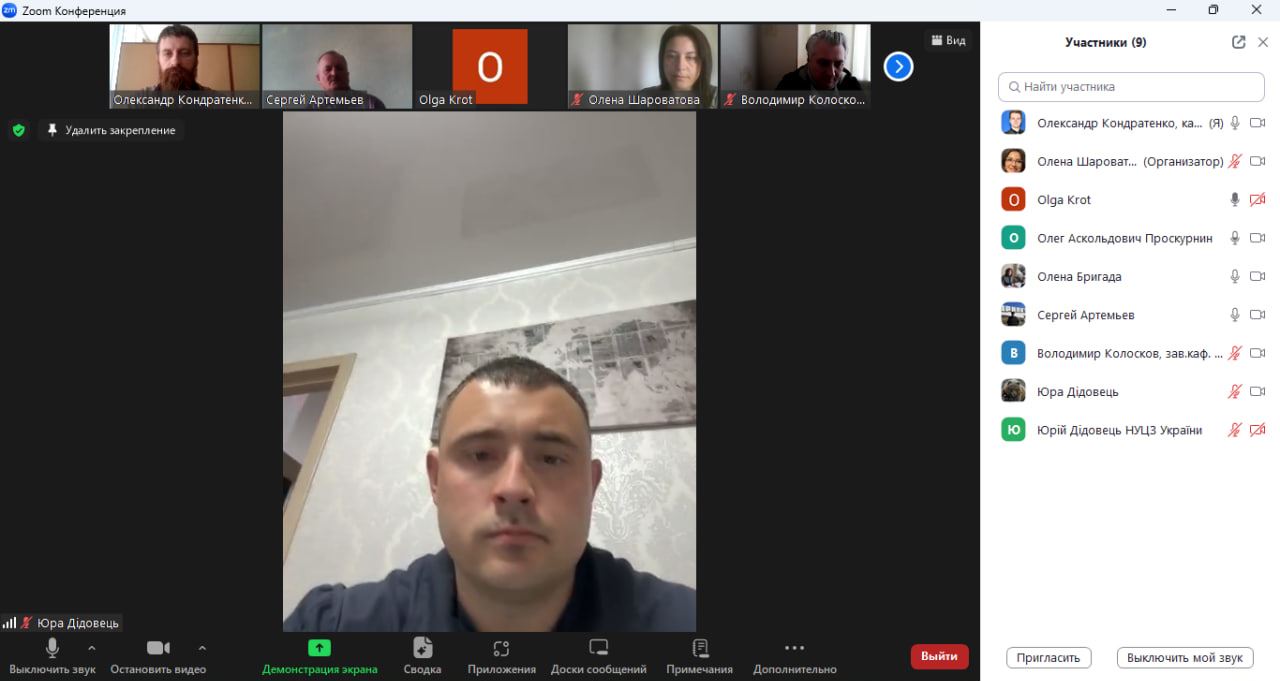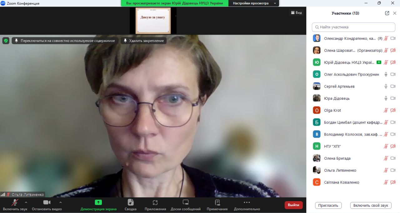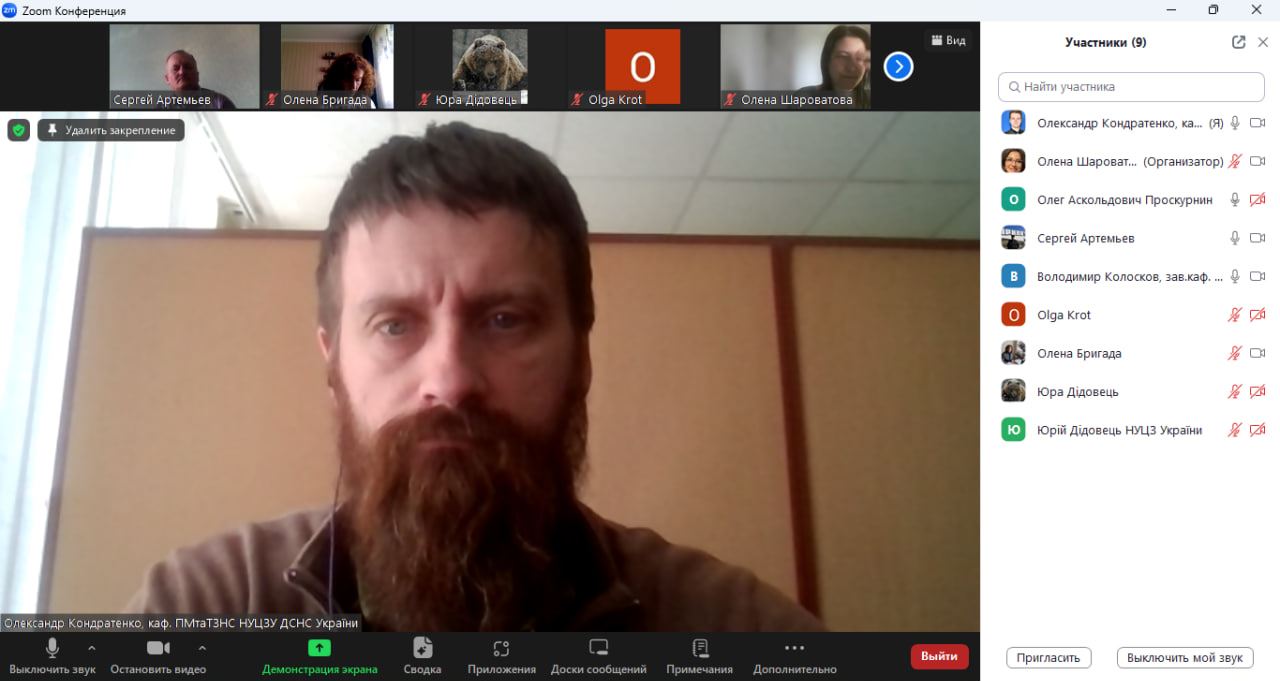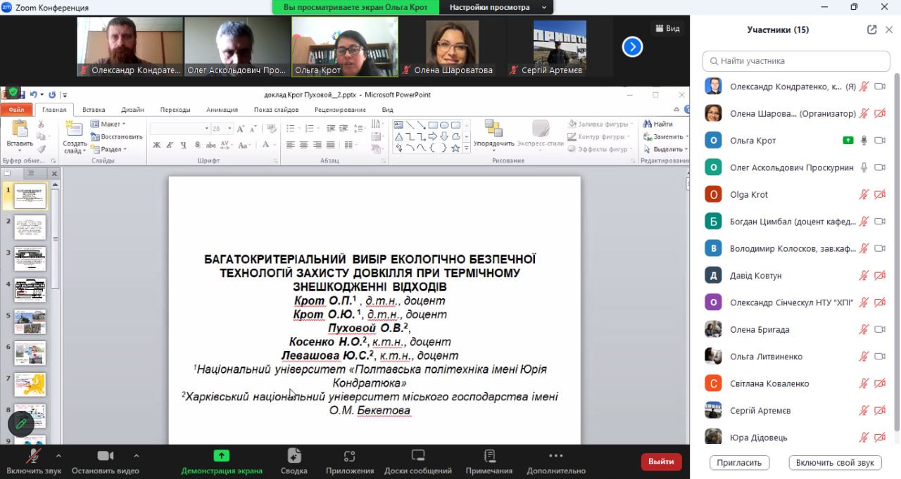 В обговоренні матеріалів доповідей також взяли участь Ольга КРОТ, д.т.н., доцент, професор кафедри прикладної екології та природокористування навчально-наукового інституту нафти і газу Національний університет «Полтавська політехніка імені Юрія Кондратюка», яка також виступила з доповіддю на тему «Багатокритеріальний вибір екологічно безпечної технологій захисту довкілля при термічному знешкодженні відходів», Вадим БАБАКІН, викладач кафедри прикладної механіки та технологій захисту навколишнього середовища факультету техногенно-екологічної безпеки НУЦЗ України, д.ю.н., доцент, Світлана КОВАЛЕНКО, магістр екології, аспірантка 3-го року денної форми навчання спеціальності 183 «Технології захисту навколишнього середовища», Давід КОВТУН, магістр екології, аспірант 1-го року денної форми навчання спеціальності 183 «Технології захисту навколишнього середовища», Вячеслав КРАСНОВ, магістр цивільної безпеки, старший лейтенант служби цивільного захисту, ад'юнкт 2-го року денної форми навчання спеціальності 183 «Технології захисту навколишнього середовища».