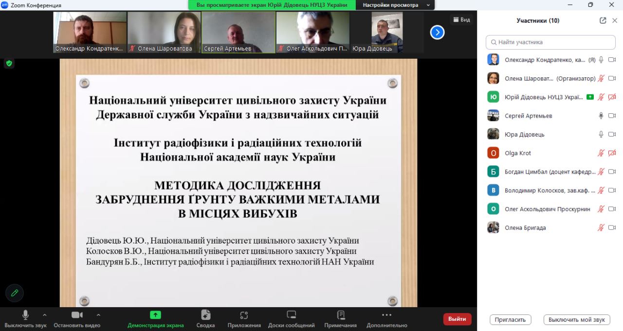 Юрій ДІДОВЕЦЬ, спеціаліст пожежної безпеки, майор служби цивільного захисту, ад'юнкт 4-го року денної форми навчання спеціальності 183 «Технології захисту навколишнього середовища», виступив з доповіддю на тему «Методика дослідження забруднення ґрунту важкими металами в місцях вибухів». Це результати дослідження авторського колективу авторів, до якого увійшли також Володимир КОЛОСКОВ, завідувач кафедри прикладної механіки та технологій захисту навколишнього середовища факультету техногенно-екологічної безпеки НУЦЗ України, к.т.н., доцент, та Борис БАНДУРЯН, старший науковий співробітник відділу фізики взаємодії випромінювання з речовиною ННЦ ХФТІ НАН України, к.ф.-м.н., с.н.с..